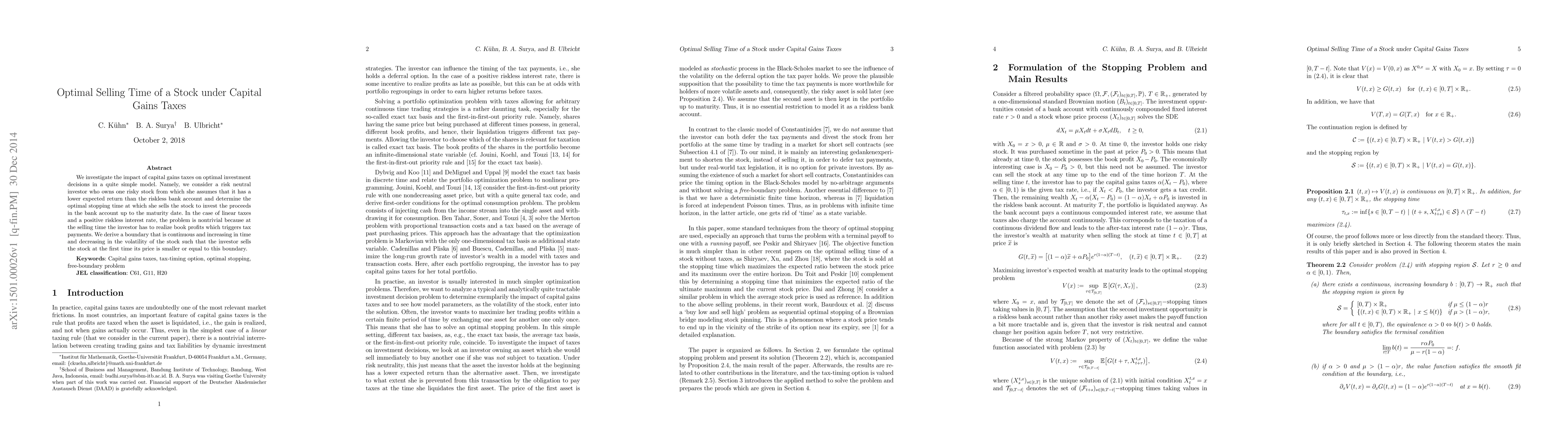 This research paper examines how capital gains taxes affect stock-selling decisions of a risk-neutral investor. Using a simple model, it derives a boundary for optimal selling time, considering tax implications and stock volatility. The boundary indicates the stock should be sold when its price drops to or below this level, balancing tax payments and investment returns.