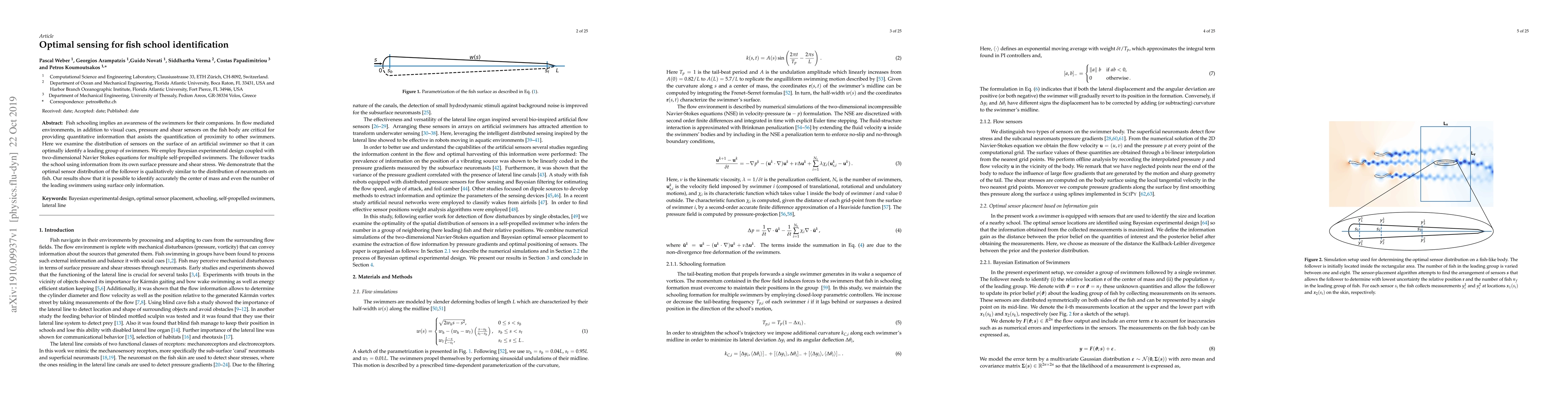Fish schooling implies an awareness of the swimmers for their companions. In flow mediated environments, in addition to visual cues, pressure and shear sensors on the fish body are critical for providing quantitative information that assists the quantification of proximity to other swimmers. Here we examine the distribution of sensors on the surface of an artificial swimmer so that it can optimally identify a leading group of swimmers. We employ Bayesian experimental design coupled with two-dimensional Navier Stokes equations for multiple self-propelled swimmers. The follower tracks the school using information from its own surface pressure and shear stress. We demonstrate that the optimal sensor distribution of the follower is qualitatively similar to the distribution of neuromasts on fish. Our results show that it is possible to identify accurately the center of mass and even the number of the leading swimmers using surface only information.