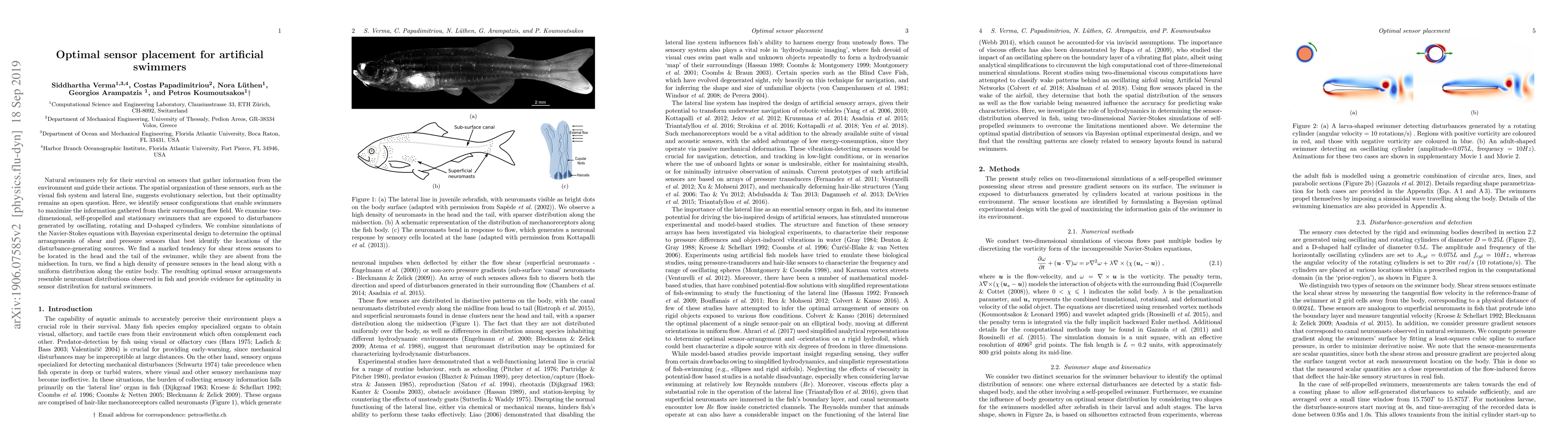 Researchers found optimal sensor placements for artificial swimmers that mimic nature, with high concentrations of shear stress sensors at the head and tail, and pressure sensors throughout the body, suggesting an evolutionary basis for these arrangements.