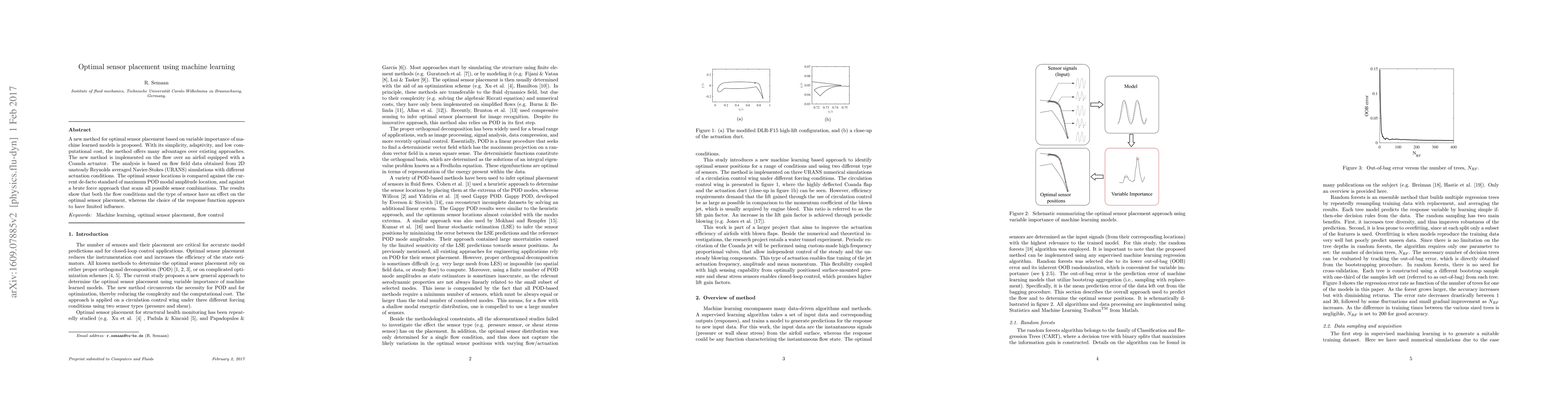 This paper proposes a new method for optimal sensor placement using machine learning, focusing on variable importance in learned models. The method is shown to outperform existing approaches in simplicity, adaptivity, and computational efficiency, as demonstrated through simulations of flow over an airfoil with a Coanda actuator.