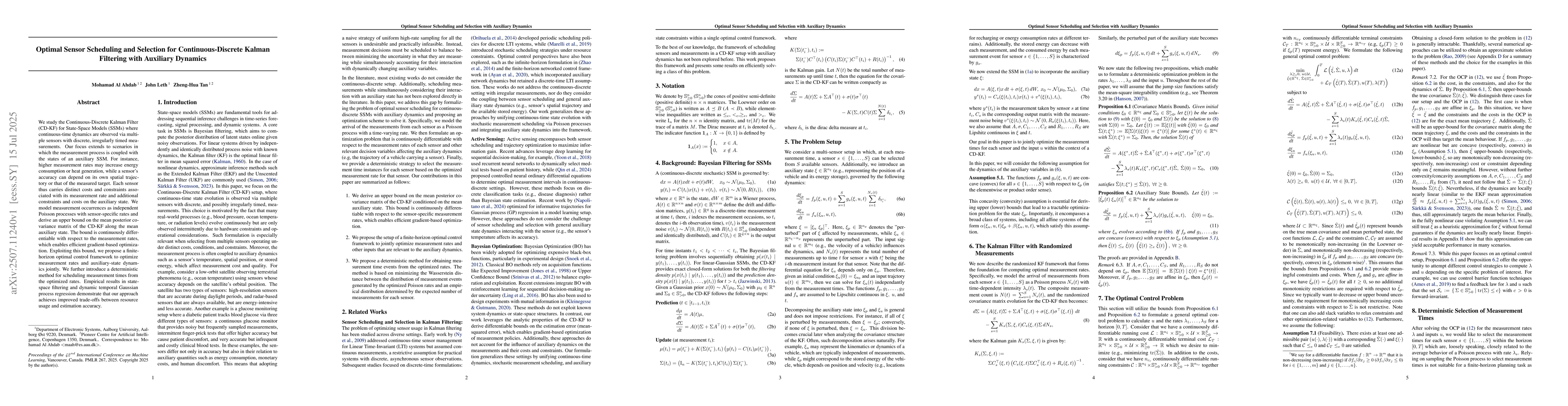 We study the Continuous-Discrete Kalman Filter (CD-KF) for State-Space Models (SSMs) where continuous-time dynamics are observed via multiple sensors with discrete, irregularly timed measurements. Our focus extends to scenarios in which the measurement process is coupled with the states of an auxiliary SSM. For instance, higher measurement rates may increase energy consumption or heat generation, while a sensor's accuracy can depend on its own spatial trajectory or that of the measured target. Each sensor thus carries distinct costs and constraints associated with its measurement rate and additional constraints and costs on the auxiliary state. We model measurement occurrences as independent Poisson processes with sensor-specific rates and derive an upper bound on the mean posterior covariance matrix of the CD-KF along the mean auxiliary state. The bound is continuously differentiable with respect to the measurement rates, which enables efficient gradient-based optimization. Exploiting this bound, we propose a finite-horizon optimal control framework to optimize measurement rates and auxiliary-state dynamics jointly. We further introduce a deterministic method for scheduling measurement times from the optimized rates. Empirical results in state-space filtering and dynamic temporal Gaussian process regression demonstrate that our approach achieves improved trade-offs between resource usage and estimation accuracy.