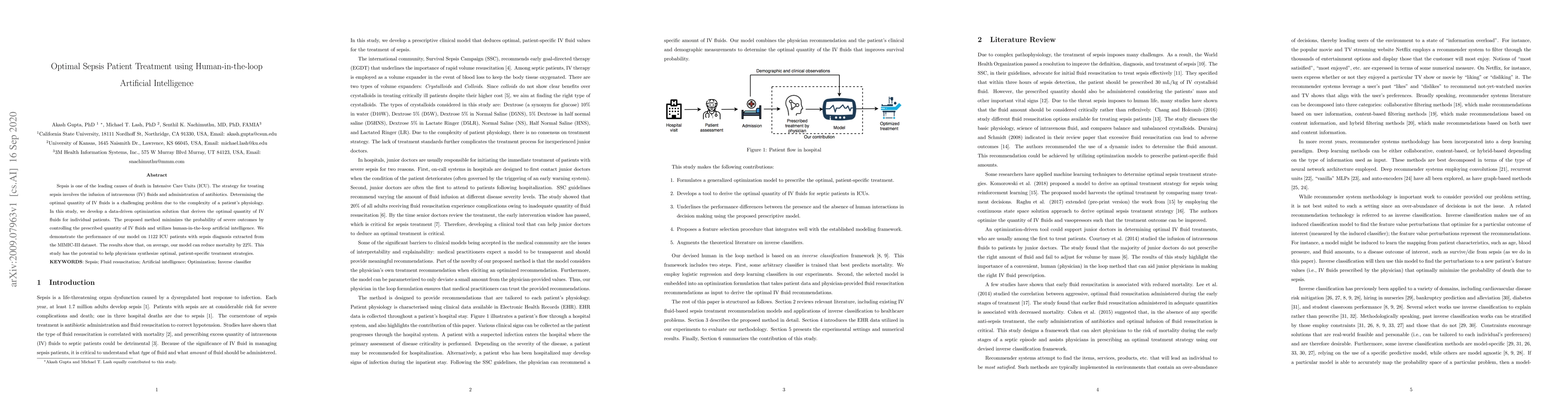 This study develops a human-in-the-loop AI model to optimize IV fluid treatment for sepsis patients, reducing mortality by 22% on average. The model uses data from the MIMIC-III dataset to determine the best fluid quantities, balancing complexity and clinical outcomes.