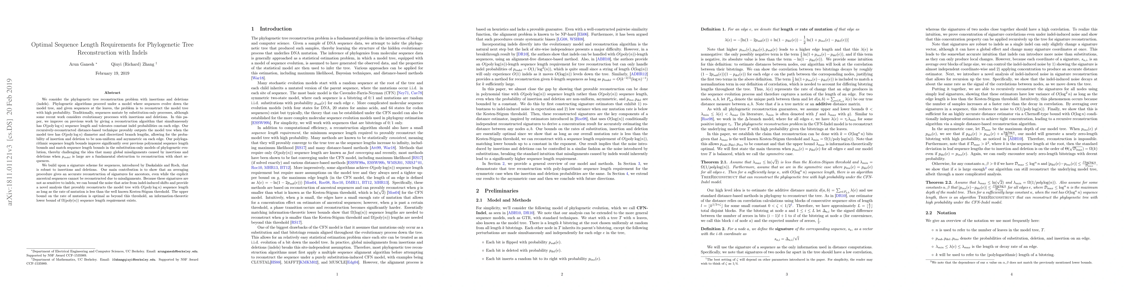 This paper presents an improved algorithm for reconstructing phylogenetic trees that accommodates insertions and deletions, achieving optimal sequence length of $O(\text{poly} \log n)$ while tolerating constant indel probabilities. The algorithm's success is guaranteed under conditions of polylogarithmic diameter and discretized branch lengths.