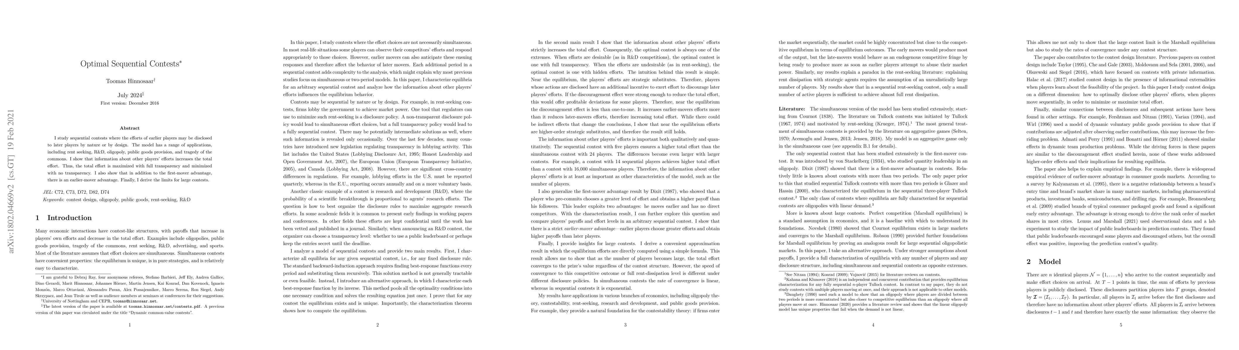 This paper examines sequential contests where earlier players' efforts can be disclosed to later ones, showing that full transparency maximizes total effort while no transparency minimizes it. It also reveals an earlier-mover advantage and derives limits for large contests.