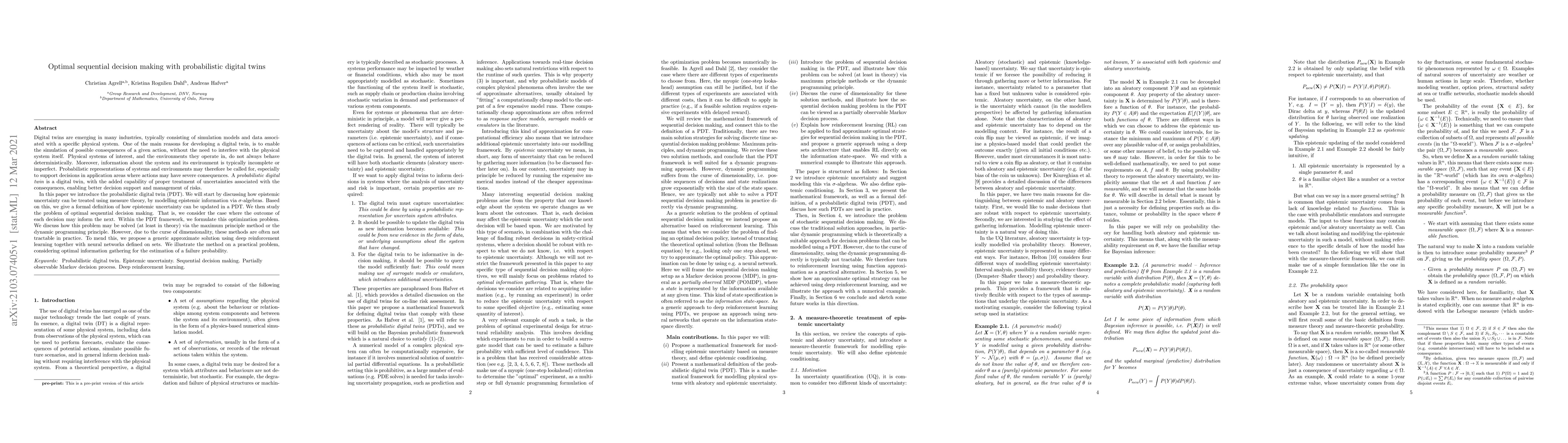 This paper introduces probabilistic digital twins to model uncertain systems and proposes deep reinforcement learning methods for optimal decision-making under uncertainty. It demonstrates the approach through a case study on estimating failure probabilities.