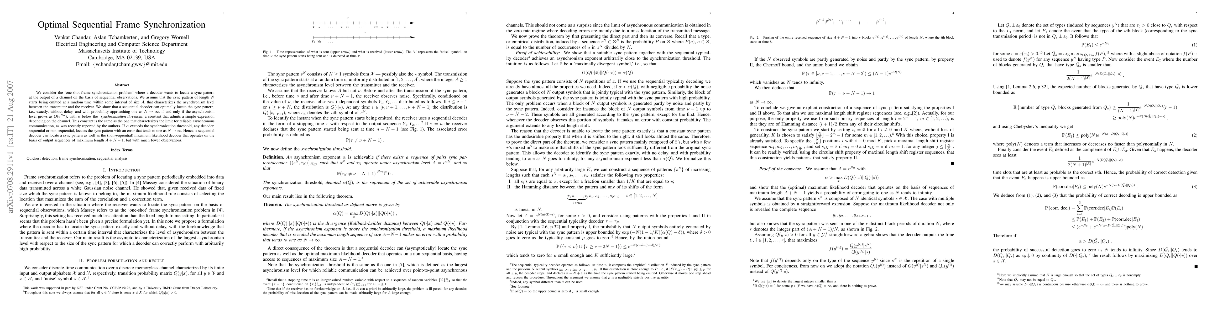 We consider the `one-shot frame synchronization problem' where a decoder wants to locate a sync pattern at the output of a channel on the basis of sequential observations. We assume that the sync pattern of length N starts being emitted at a random time within some interval of size A, that characterizes the asynchronism level between the transmitter and the receiver. We show that a sequential decoder can optimally locate the sync pattern, i.e., exactly, without delay, and with probability approaching one as N tends to infinity, if and only if the asynchronism level grows as O(exp(N*k)), with k below the `synchronization threshold,' a constant that admits a simple expression depending on the channel. This constant is the same as the one that characterizes the limit for reliable asynchronous communication, as was recently reported by the authors. If k exceeds the synchronization threshold, any decoder, sequential or non-sequential, locates the sync pattern with an error that tends to one as N tends to infinity. Hence, a sequential decoder can locate a sync pattern as well as the (non-sequential) maximum likelihood decoder that operates on the basis of output sequences of maximum length A+N-1, but with much fewer observations.