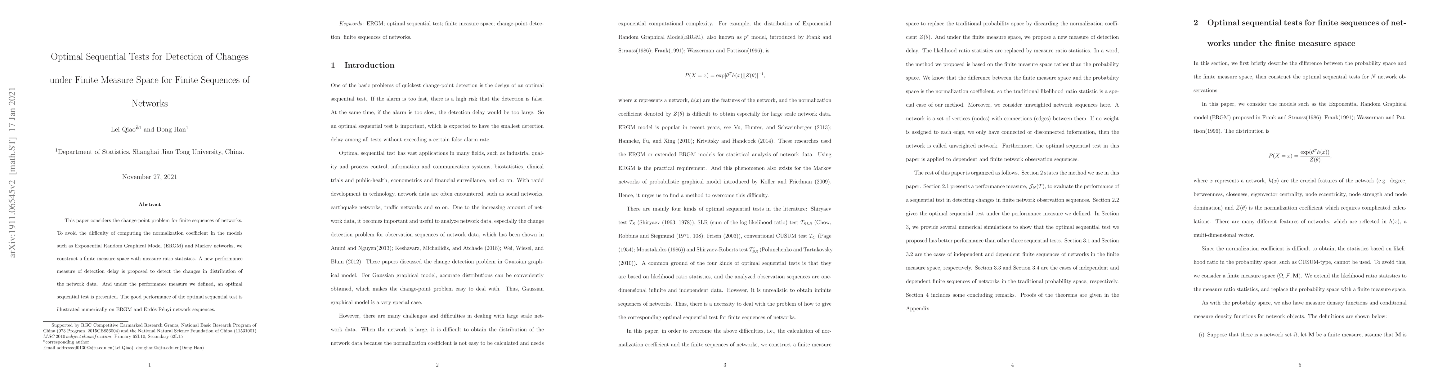 This paper considers the change-point problem for finite sequences of networks. To avoid the difficulty of computing the normalization coefficient, such as in Exponential random graphical models (ERGMs) and Markov networks, we construct a finite measure space with measure ratio statistics. A new performance measure of detection delay is proposed to detect the changes in distribution of the network. And an optimal sequential test is proposed under the performance measure. The good performance of the optimal sequential test is illustrated numerically on ERGMs and Erdos-R\'{e}nyi network sequences.