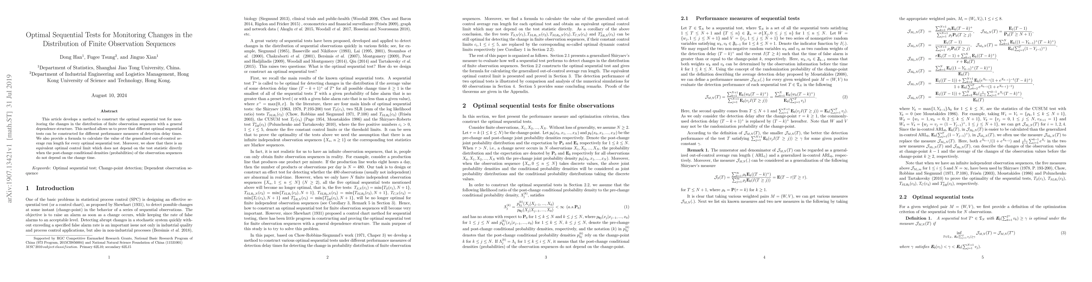 This article develops a method to construct the optimal sequential test for monitoring the changes in the distribution of finite observation sequences with a general dependence structure. This method allows us to prove that different optimal sequential tests can be constructed for different performance measures of detection delay times. We also provide a formula to calculate the value of the generalized out-of-control average run length for every optimal sequential test. Moreover, we show that there is an equivalent optimal control limit which does not depend on the test statistic directly when the post-change conditional densities (probabilities) of the observation sequences do not depend on the change time.