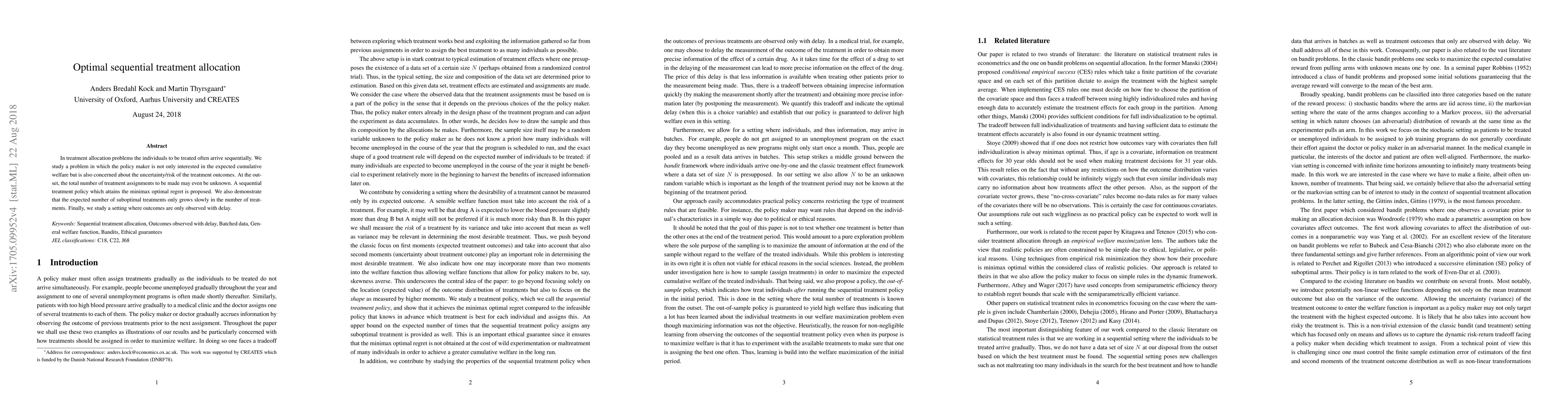 This paper proposes a sequential treatment allocation policy that minimizes regret while considering both expected cumulative welfare and treatment outcome uncertainty. It demonstrates that the number of suboptimal treatments grows slowly and addresses delayed outcome observations.