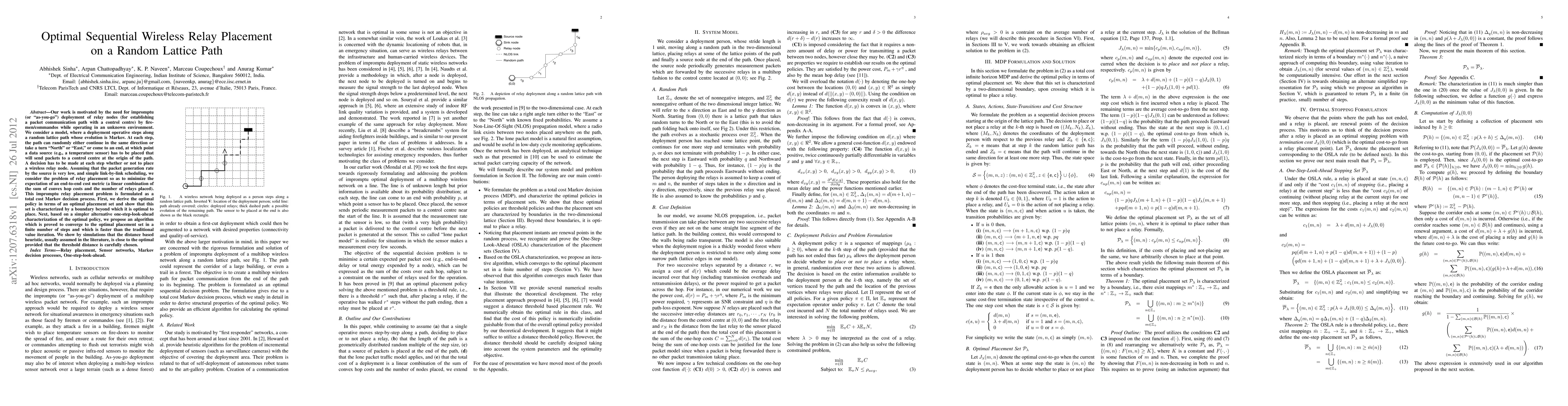 This paper addresses the optimal placement of wireless relay nodes along a random lattice path to establish communication with a control center. It formulates the problem as a Markov decision process and proposes an algorithm that converges to the optimal placement set, demonstrating that a distance-based heuristic can be effective if the threshold distance is appropriately chosen.