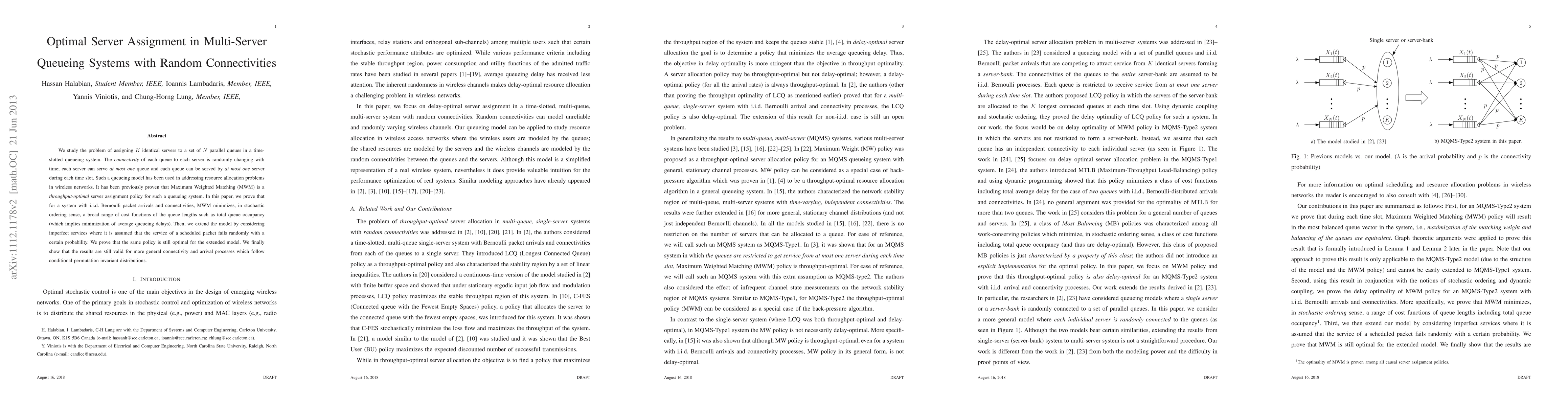 This paper investigates optimal server assignment in multi-server queueing systems with fluctuating connectivity, proving that Maximum Weighted Matching minimizes various queue length metrics. It extends the model to imperfect service scenarios, maintaining the optimality of the matching policy under broader connectivity and arrival conditions.