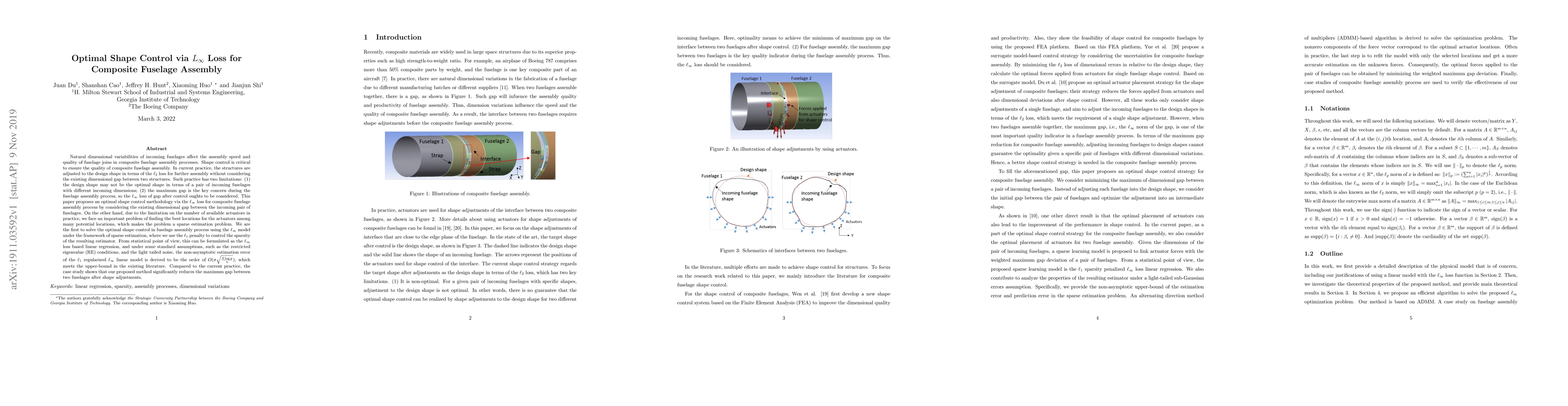 This paper proposes an optimal shape control methodology using $\ell_\infty$ loss for composite fuselage assembly, addressing the limitations of current $\ell_2$ loss methods by considering dimensional gaps. It introduces a sparse estimation approach to determine the best actuator locations, achieving significant reductions in the maximum gap between fuselages.