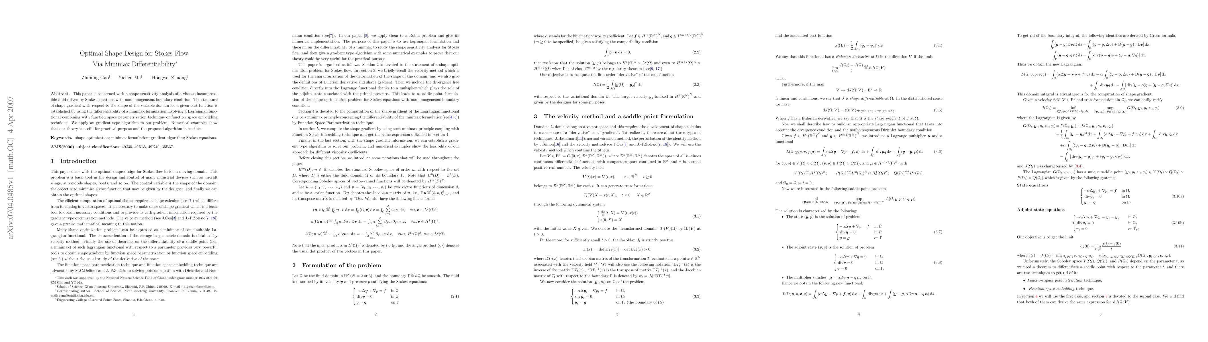 This paper develops a shape sensitivity analysis for Stokes flow using a minimax differentiability approach, establishing a shape gradient for a given cost function. An algorithm based on this approach is shown to be practical and effective through numerical examples.