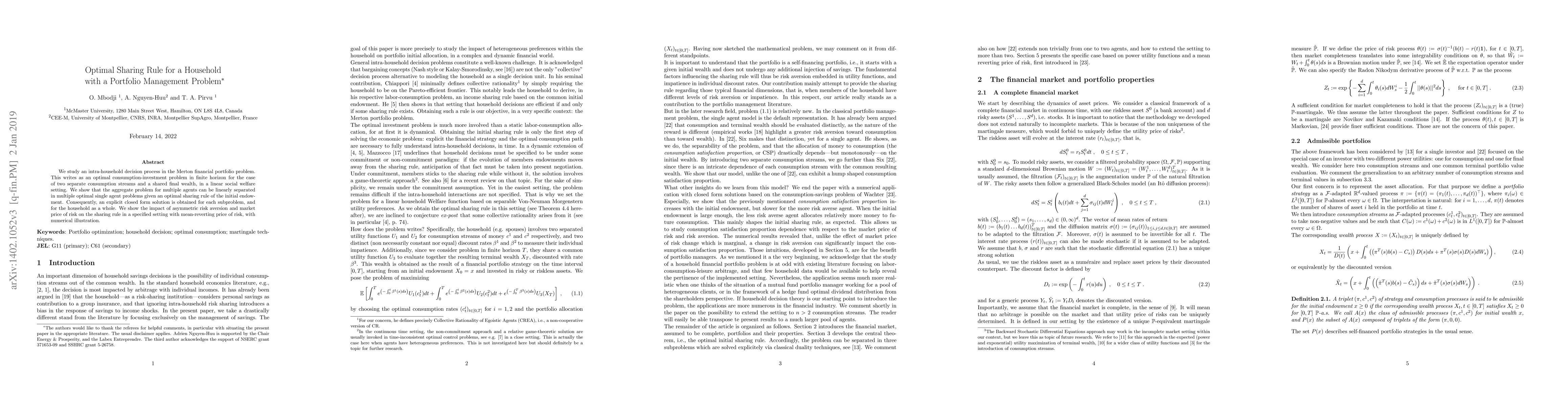 We study the Merton problem of optimal consumption-investment for the case of two investors sharing a final wealth. The typical example would be a husband and wife sharing a portfolio looking to optimize the expected utility of consumption and final wealth. Each agent has different utility function and discount factor. An explicit formulation for the optimal consumptions and portfolio can be obtained in the case of a complete market. The problem is shown to be equivalent to maximizing three different utilities separately with separate initial wealths. We study a numerical example where the market price of risk is assumed to be mean reverting, and provide insights on the influence of risk aversion or discount rates on the initial optimal allocation.
