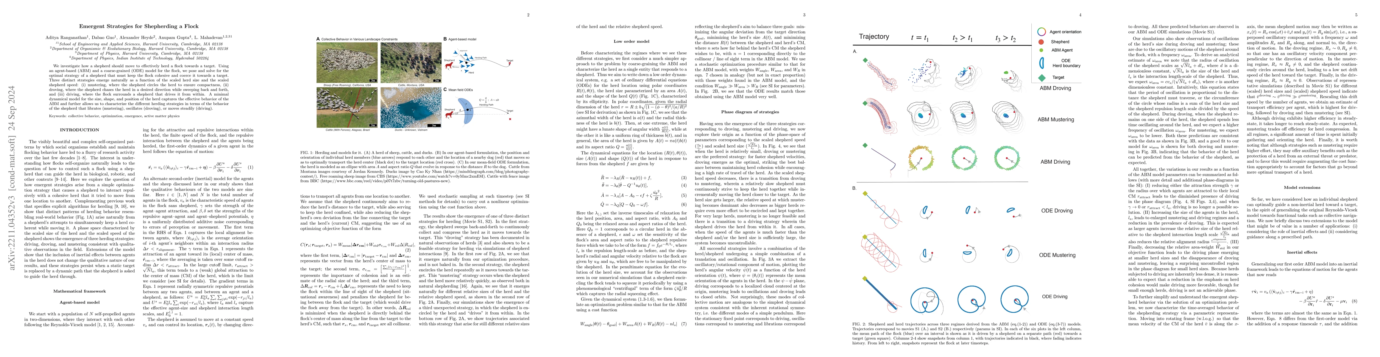 We investigate how a shepherd should move in order to effectively herd and guide a flock of agents towards a target. Using a detailed agent-based model (ABM) for the members of the flock, we pose and solve an optimization problem for the shepherd that has to simultaneously work to keep the flock cohesive while coercing it towards a prescribed project. We find that three distinct strategies emerge as potential solutions as a function of just two parameters: the ratio of herd size to shepherd repulsion length and the ratio of herd speed to shepherd speed. We term these as: (i) mustering, in which the shepherd circles the herd to ensure compactness, (ii) droving, in which the shepherd chases the herd in a desired direction, and (iii) driving, a hitherto unreported strategy where the flock surrounds a shepherd that drives it from within. A minimal dynamical model for the size, shape and position of the herd captures the effective behavior of the ABM, and further allows us to characterize the different herding strategies in terms of the behavior of the shepherd that librates (mustering), oscillates (droving) or moves steadily (driving). All together, our study yields a simple and intuitive classification of herding strategies that ought to be of general interest in the context of controlling the collective behavior of active matter.