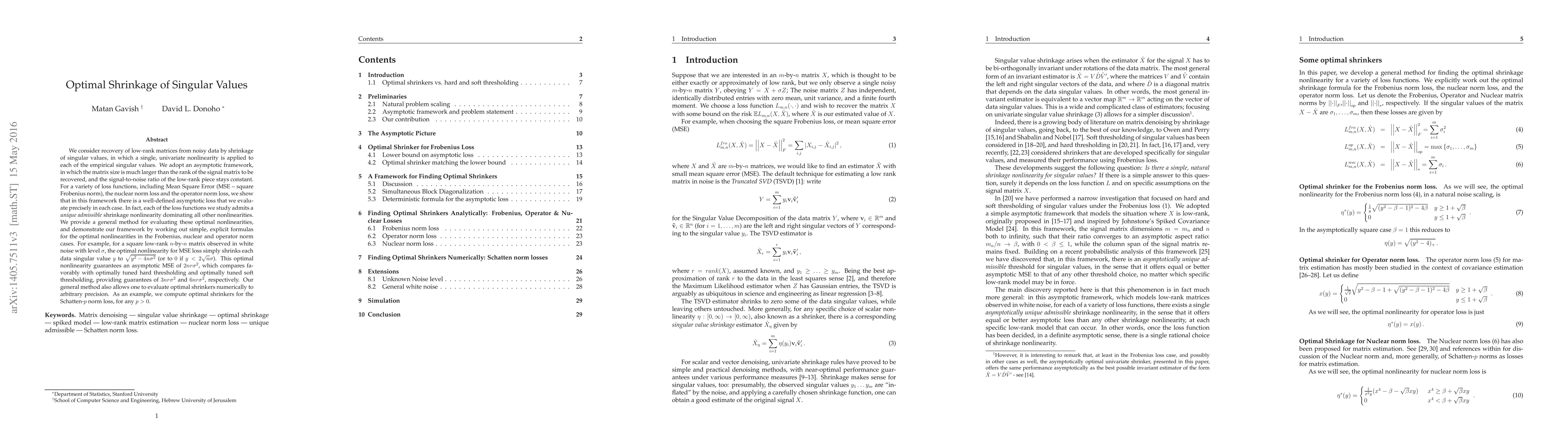 We consider recovery of low-rank matrices from noisy data by shrinkage of singular values, in which a single, univariate nonlinearity is applied to each of the empirical singular values. We adopt an asymptotic framework, in which the matrix size is much larger than the rank of the signal matrix to be recovered, and the signal-to-noise ratio of the low-rank piece stays constant. For a variety of loss functions, including Mean Square Error (MSE - square Frobenius norm), the nuclear norm loss and the operator norm loss, we show that in this framework there is a well-defined asymptotic loss that we evaluate precisely in each case. In fact, each of the loss functions we study admits a unique admissible shrinkage nonlinearity dominating all other nonlinearities. We provide a general method for evaluating these optimal nonlinearities, and demonstrate our framework by working out simple, explicit formulas for the optimal nonlinearities in the Frobenius, nuclear and operator norm cases. For example, for a square low-rank n-by-n matrix observed in white noise with level $\sigma$, the optimal nonlinearity for MSE loss simply shrinks each data singular value $y$ to $\sqrt{y^2-4n\sigma^2 }$ (or to 0 if $y<2\sqrt{n}\sigma$). This optimal nonlinearity guarantees an asymptotic MSE of $2nr\sigma^2$, which compares favorably with optimally tuned hard thresholding and optimally tuned soft thresholding, providing guarantees of $3nr\sigma^2$ and $6nr\sigma^2$, respectively. Our general method also allows one to evaluate optimal shrinkers numerically to arbitrary precision. As an example, we compute optimal shrinkers for the Schatten-p norm loss, for any p>0.