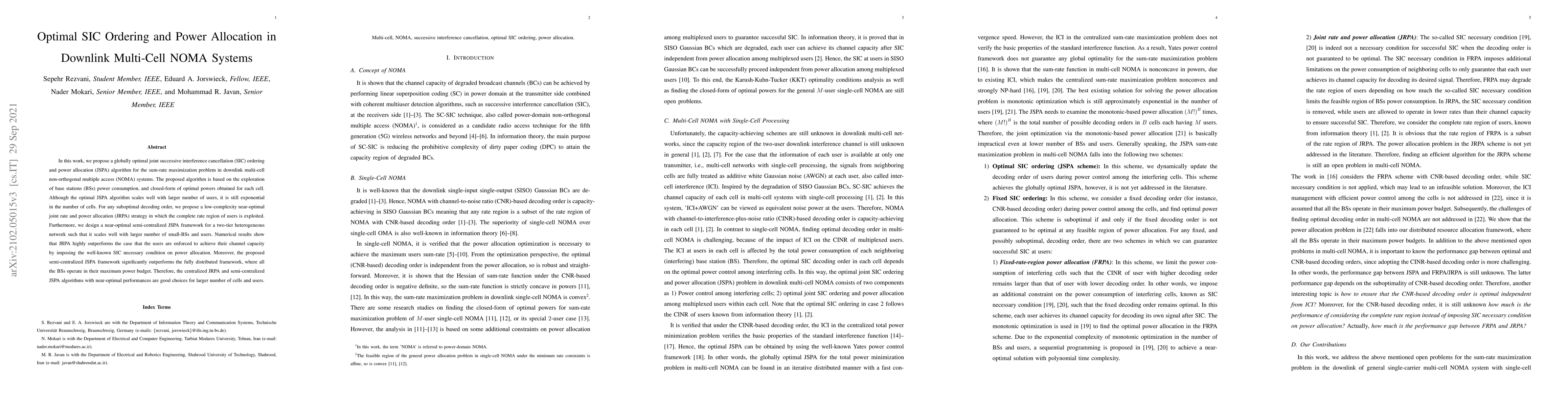 The paper presents a JSPA algorithm for optimal SIC ordering and power allocation in multi-cell NOMA systems, along with a low-complexity JRPA strategy and a semi-centralized JSPA framework for two-tier heterogeneous networks.