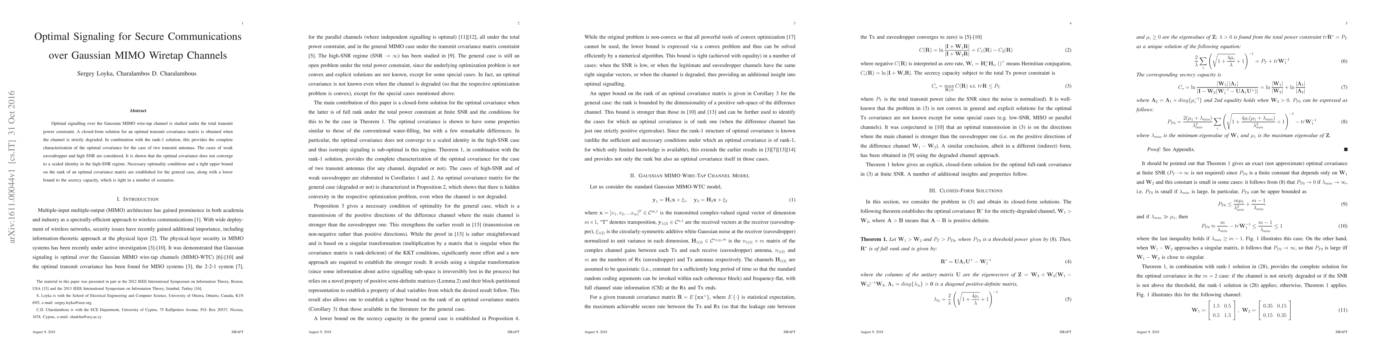 This paper studies optimal signaling strategies for secure communications over Gaussian MIMO wiretap channels, deriving a closed-form solution for the optimal transmit covariance matrix under total power constraints, especially for strictly degraded channels and two transmit antennas. It also establishes necessary optimality conditions and bounds for the general case, showing that the optimal covariance does not converge to a scaled identity in high SNR scenarios.