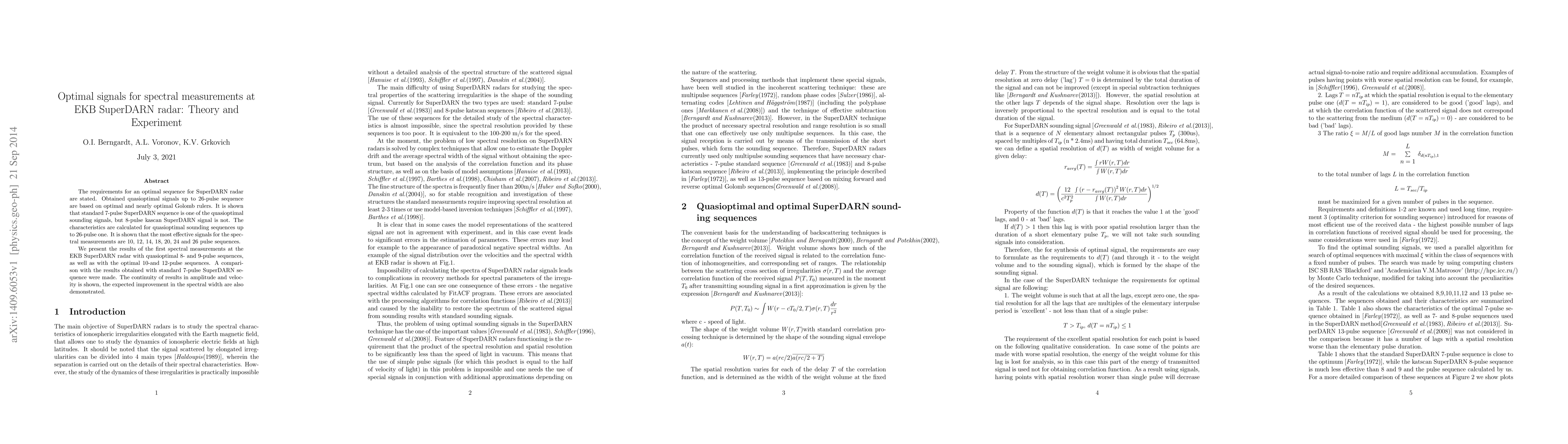 This paper explores optimal signal sequences for spectral measurements at EKB SuperDARN radar, identifying quasioptimal Golomb rulers up to 26 pulses. It demonstrates that while the standard 7-pulse sequence is quasioptimal, the 8-pulse kascan sequence is not, and highlights the most effective sequences for spectral measurements as 10, 12, 14, 18, 20, 24, and 26 pulses. Experimental results show improved spectral width and continuity using quasioptimal sequences compared to the standard 7-pulse sequence.