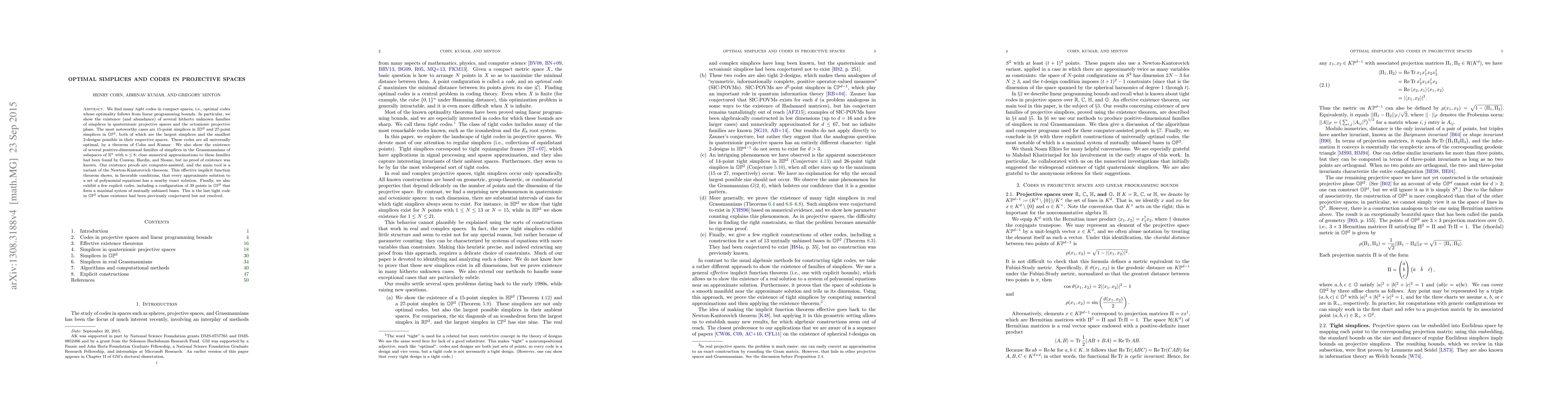 We find many tight codes in compact spaces, i.e., optimal codes whose optimality follows from linear programming bounds. In particular, we show the existence (and abundance) of several hitherto unknown families of simplices in quaternionic projective spaces and the octonionic projective plane. The most noteworthy cases are 15-point simplices in HP^2 and 27-point simplices in OP^2, both of which are the largest simplices and the smallest 2-designs possible in their respective spaces. These codes are all universally optimal, by a theorem of Cohn and Kumar. We also show the existence of several positive-dimensional families of simplices in the Grassmannians of subspaces of R^n with n <= 8; close numerical approximations to these families had been found by Conway, Hardin, and Sloane, but no proof of existence was known. Our existence proofs are computer-assisted, and the main tool is a variant of the Newton-Kantorovich theorem. This effective implicit function theorem shows, in favorable conditions, that every approximate solution to a set of polynomial equations has a nearby exact solution. Finally, we also exhibit a few explicit codes, including a configuration of 39 points in OP^2 that form a maximal system of mutually unbiased bases. This is the last tight code in OP^2 whose existence had been previously conjectured but not resolved.