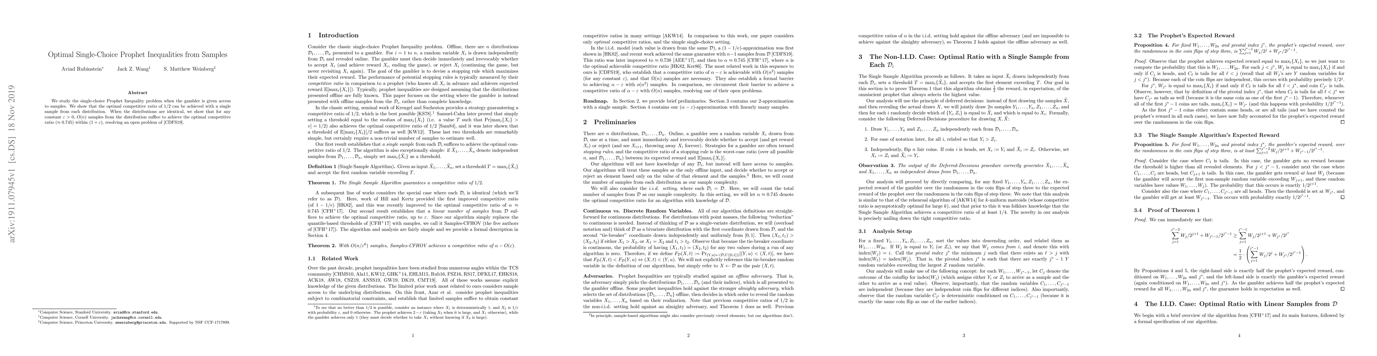 Researchers show that a single sample from each distribution is enough to achieve an optimal competitive ratio of 1/2 in the Prophet Inequality problem. With identical distributions, multiple samples can be used to achieve near-optimal ratios within a small margin of error.
