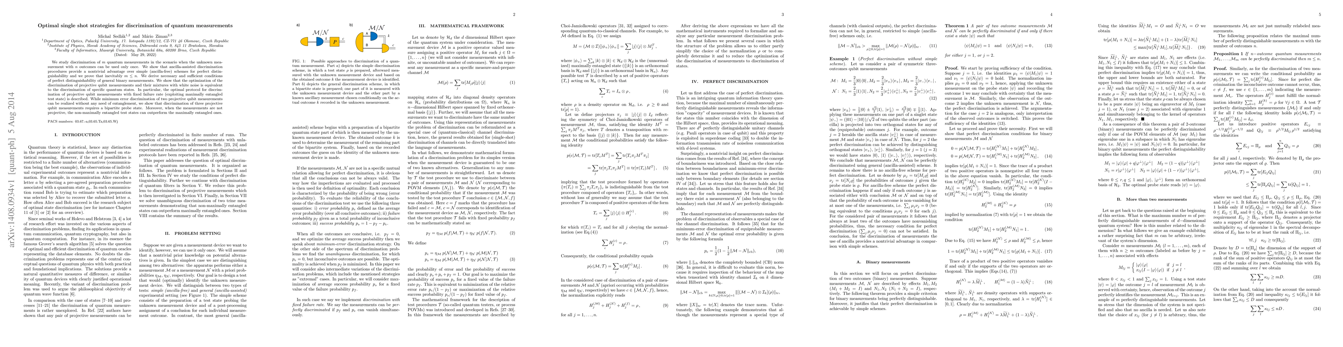 This paper investigates optimal single-shot strategies for discriminating between m quantum measurements with n outcomes, demonstrating that ancilla-assisted methods outperform ancilla-free schemes. The study reveals that perfect distinguishability requires m ≤ n and provides conditions for general binary measurements.