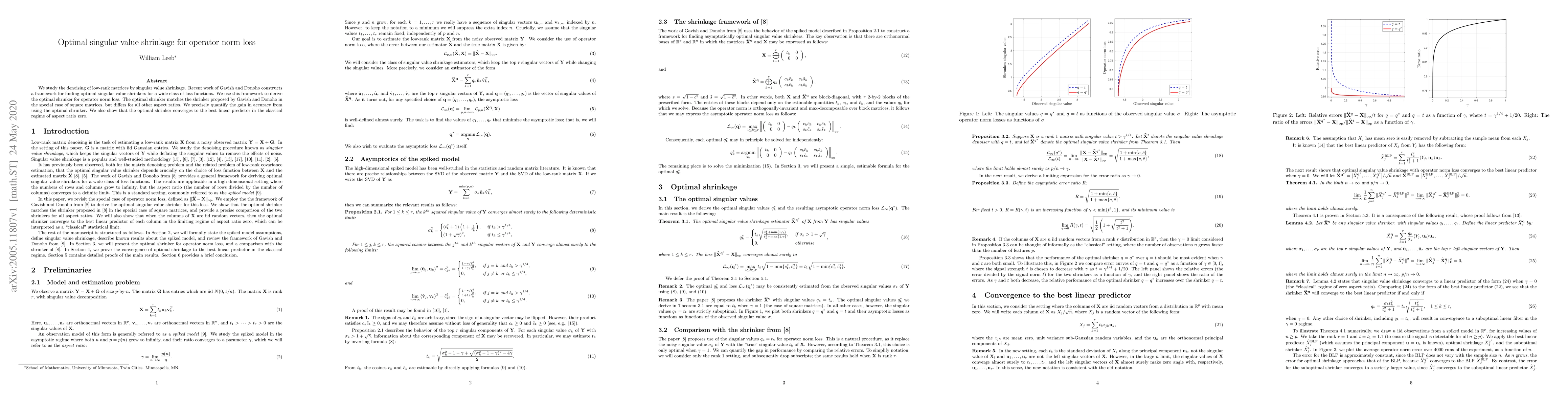 This paper develops an optimal singular value shrinkage method for denoising low-rank matrices under operator norm loss, differing from previous methods for non-square matrices and demonstrating improved accuracy and convergence to the best linear predictor.