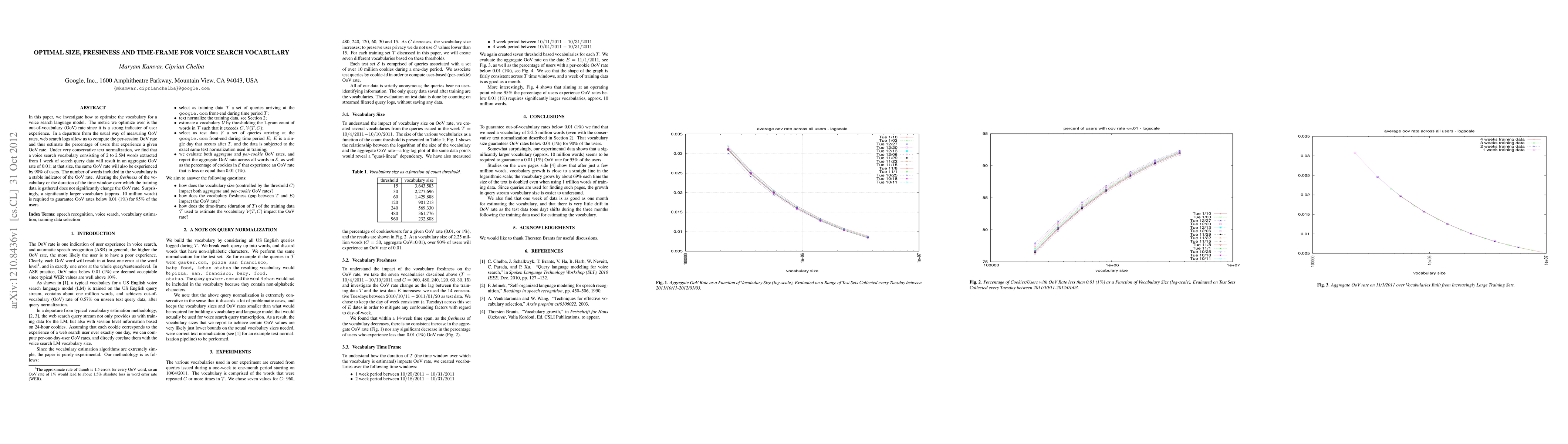 In this paper, we investigate how to optimize the vocabulary for a voice search language model. The metric we optimize over is the out-of-vocabulary (OoV) rate since it is a strong indicator of user experience. In a departure from the usual way of measuring OoV rates, web search logs allow us to compute the per-session OoV rate and thus estimate the percentage of users that experience a given OoV rate. Under very conservative text normalization, we find that a voice search vocabulary consisting of 2 to 2.5 million words extracted from 1 week of search query data will result in an aggregate OoV rate of 1%; at that size, the same OoV rate will also be experienced by 90% of users. The number of words included in the vocabulary is a stable indicator of the OoV rate. Altering the freshness of the vocabulary or the duration of the time window over which the training data is gathered does not significantly change the OoV rate. Surprisingly, a significantly larger vocabulary (approximately 10 million words) is required to guarantee OoV rates below 1% for 95% of the users.