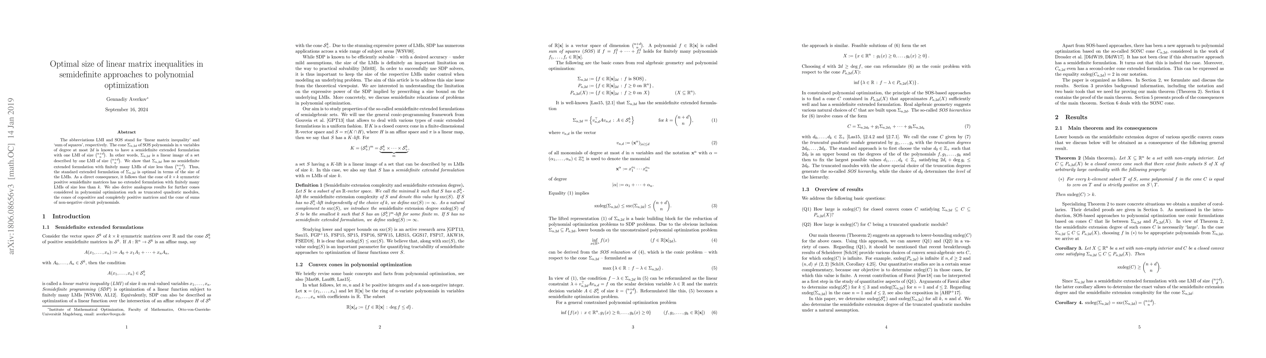 This paper demonstrates that the optimal size of linear matrix inequalities (LMIs) in semidefinite formulations for polynomial optimization is $\binom{n+d}{n}$. It shows that no smaller set of LMIs can represent the cone of sum of squares (SOS) polynomials, proving the optimality of the standard extended formulation.