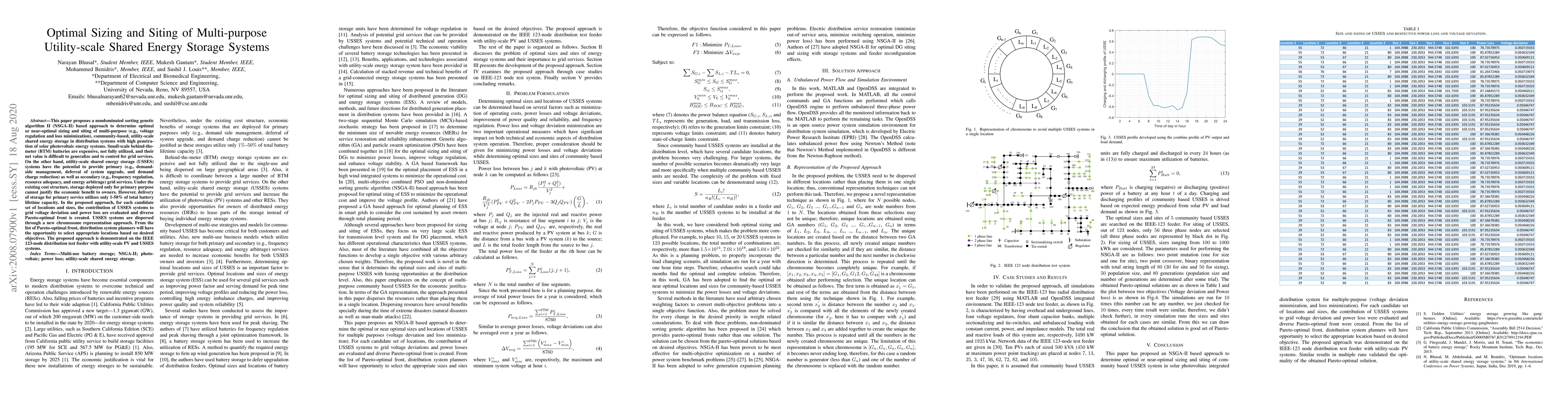 This paper uses a nondominated sorting genetic algorithm II (NSGA-II) to optimize the sizing and siting of utility-scale shared energy storage systems for multiple grid services, aiming to maximize their economic benefits and efficiency. The approach evaluates the contribution of these systems to voltage regulation and loss minimization in distribution networks with high solar PV penetration.