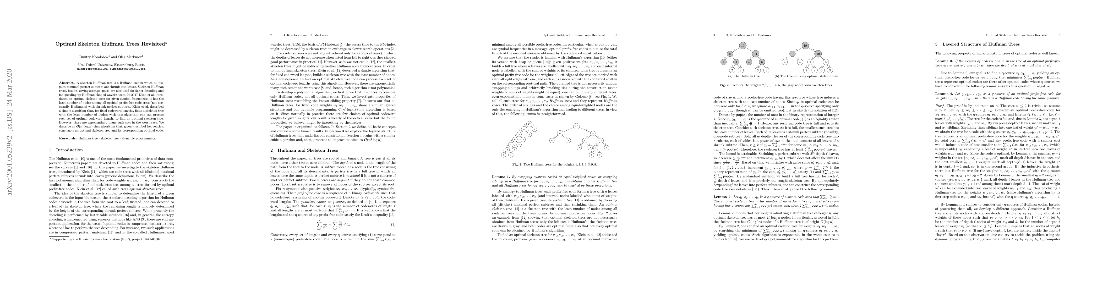 A skeleton Huffman tree is a Huffman tree in which all disjoint maximal perfect subtrees are shrunk into leaves. Skeleton Huffman trees, besides saving storage space, are also used for faster decoding and for speeding up Huffman-shaped wavelet trees. In 2017 Klein et al. introduced an optimal skeleton tree: for given symbol frequencies, it has the least number of nodes among all optimal prefix-free code trees (not necessarily Huffman's) with shrunk perfect subtrees. Klein et al. described a simple algorithm that, for fixed codeword lengths, finds a skeleton tree with the least number of nodes; with this algorithm one can process each set of optimal codeword lengths to find an optimal skeleton tree. However, there are exponentially many such sets in the worst case. We describe an $O(n^2\log n)$-time algorithm that, given $n$ symbol frequencies, constructs an optimal skeleton tree and its corresponding optimal code.