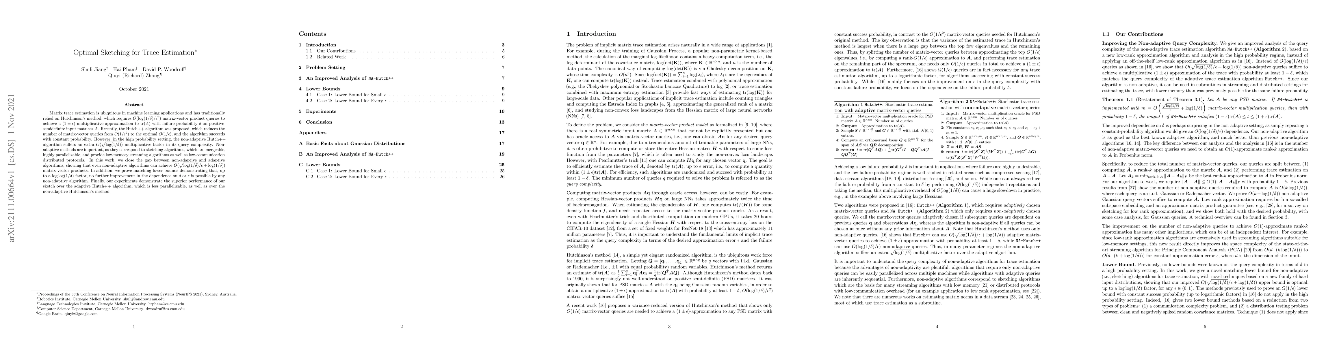 The paper introduces an optimized non-adaptive sketching algorithm, NA-Hutch++, and proves tight lower bounds on the query complexity for non-adaptive trace estimation algorithms, up to a log log(1/δ) factor.