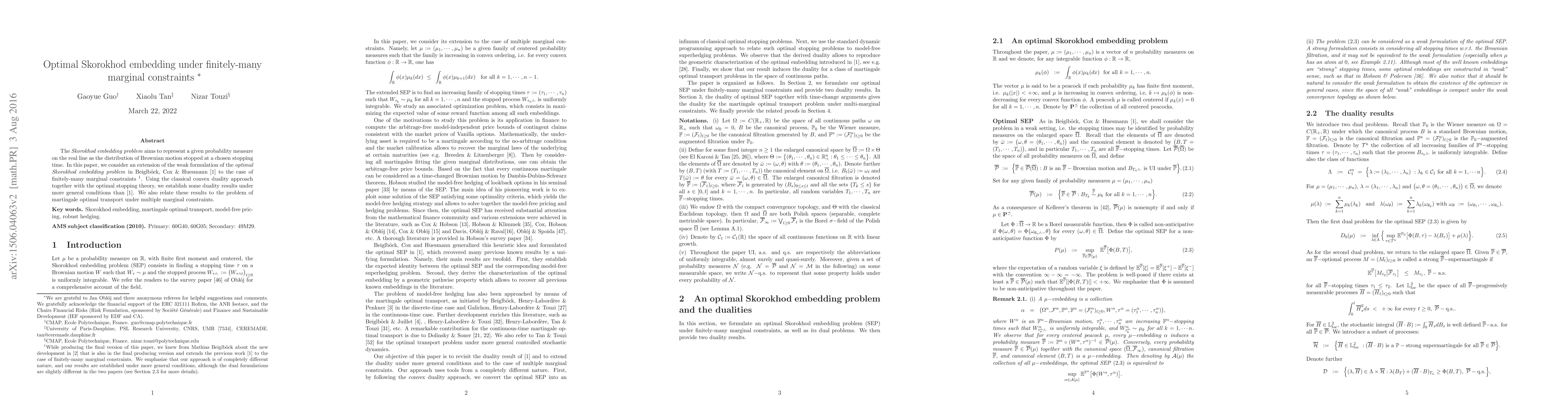 This paper extends the optimal Skorokhod embedding problem to include finitely-many marginal constraints, utilizing convex duality and optimal stopping theory to derive duality results expressed through probability measures. It connects these findings to the problem of martingale optimal transport with multiple marginal constraints.