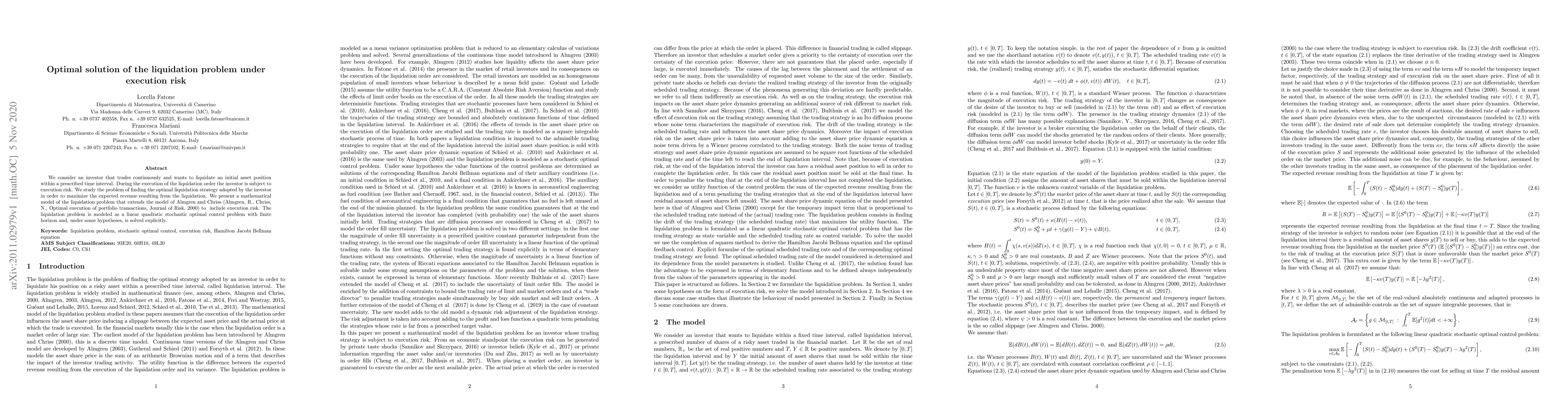 This paper develops a mathematical model for an investor's optimal liquidation strategy under execution risk, extending the Almgren and Chriss model. It formulates the problem as a linear quadratic stochastic optimal control problem and provides an explicit solution under certain assumptions.