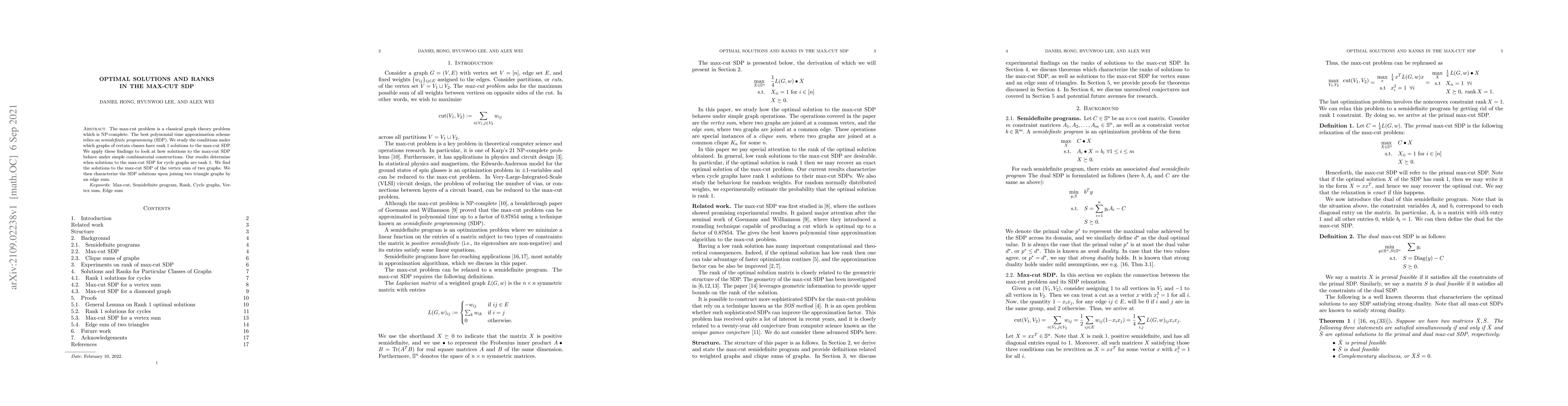 The max-cut problem is a classical graph theory problem which is NP-complete. The best polynomial time approximation scheme relies on \emph{semidefinite programming} (SDP). We study the conditions under which graphs of certain classes have rank~1 solutions to the max-cut SDP. We apply these findings to look at how solutions to the max-cut SDP behave under simple combinatorial constructions. Our results determine when solutions to the max-cut SDP for cycle graphs are rank~1. We find the solutions to the max-cut SDP of the vertex~sum of two graphs. We then characterize the SDP solutions upon joining two triangle graphs by an edge~sum.