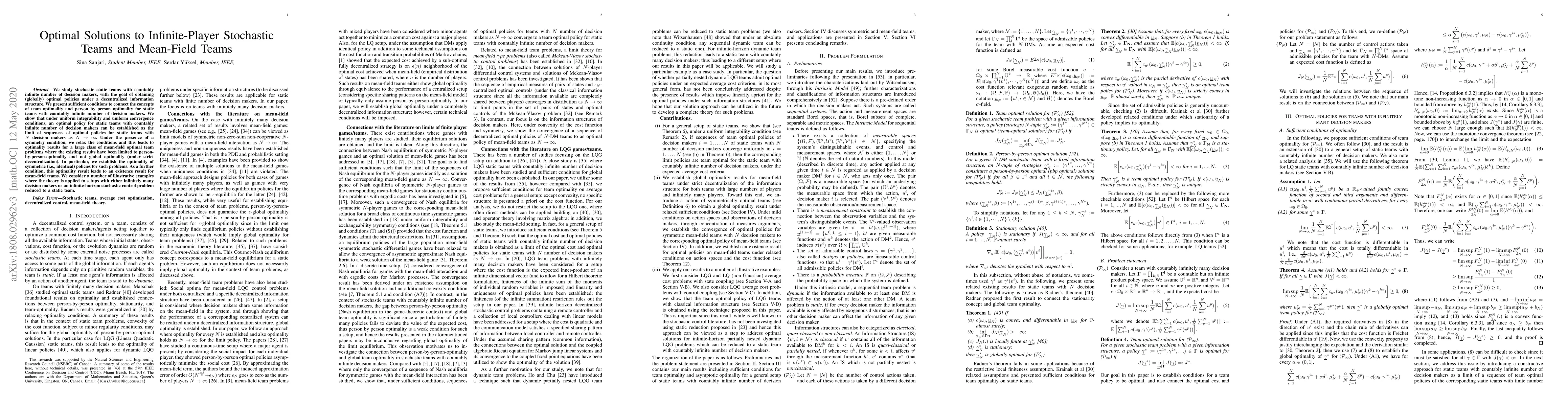 This paper explores optimal policies for infinite-player stochastic teams under decentralized information, establishing conditions for global optimality as the limit of finite-player optimal policies. It also proves the optimality of symmetric policies in mean-field teams, extending beyond person-by-person optimality and providing existence results for such teams.