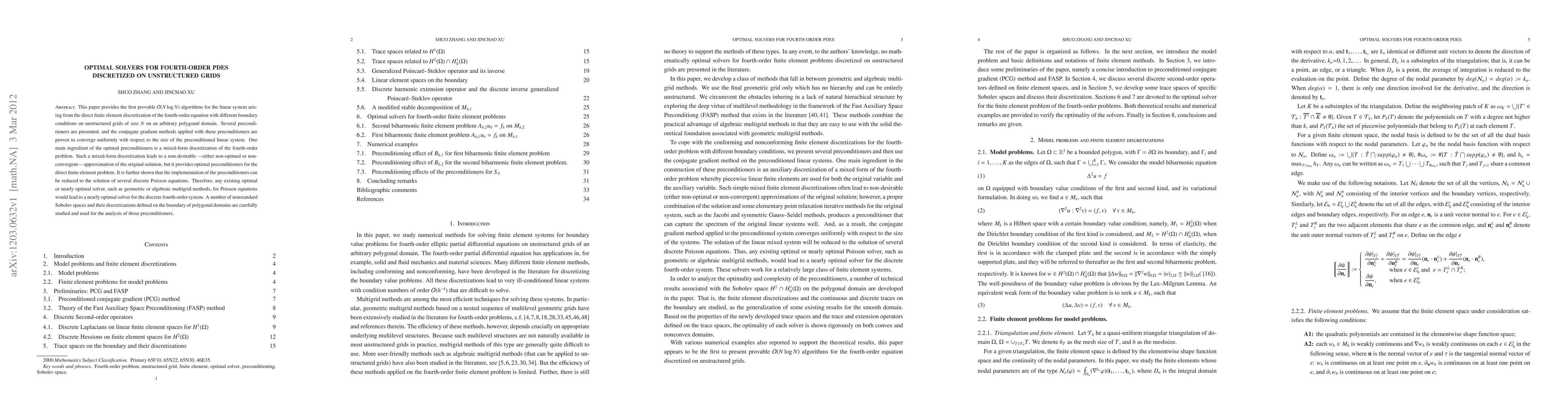 This paper provides the first provable $\mathcal{O}(N \log N)$ algorithms for the linear system arising from the direct finite element discretization of the fourth-order equation with different boundary conditions on unstructured grids of size $N$ on an arbitrary polygoanl domain. Several preconditioners are presented, and the conjugate gradient methods applied with these preconditioners are proven to converge uniformly with respect to the size of the preconditioned linear system. One main ingredient of the optimal preconditioners is a mixed-form discretization of the fourth-order problem. Such a mixed-form discretization leads to a non-desirable ---either non-optimal or non-convergent--- approximation of the original solution, but it provides optimal preconditioners for the direct finite element problem. It is further shown that the implementation of the preconditioners can be reduced to the solution of several discrete Poisson equations. Therefore, any existing optimal or nearly optimal solver, such as geometric or algebraic multigrid methods, for Poisson equations would lead to a nearly optimal solver for the discrete fourth-order system. A number of nonstandard Sobolev spaces and their discretizations defined on the boundary of polygonal domains are carefully studied and used for the analysis of those preconditioners.