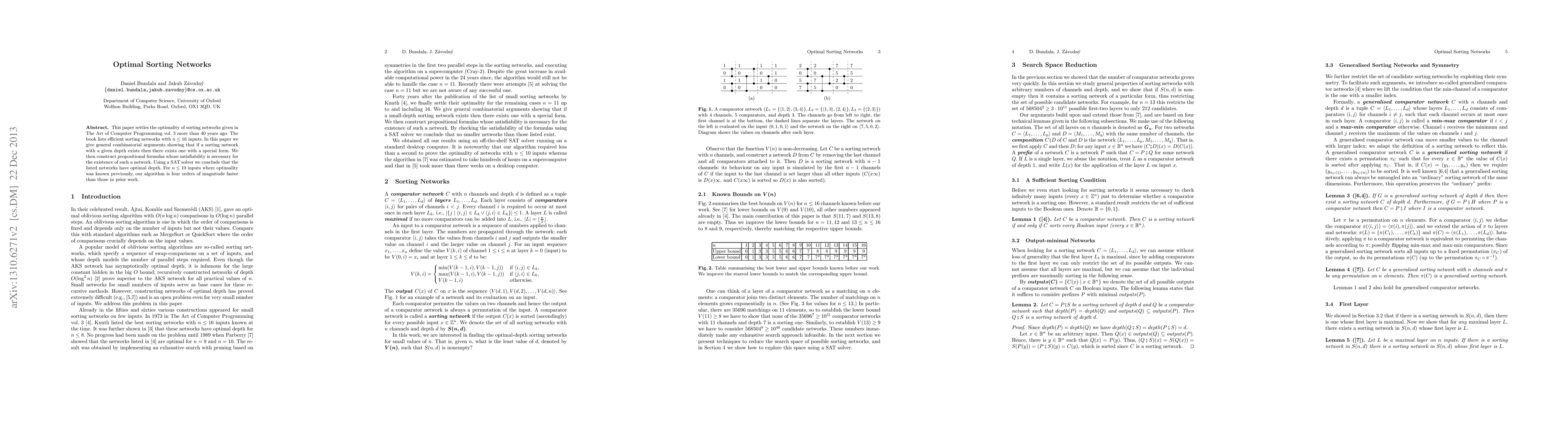 This paper proves the optimality of sorting networks with up to 16 inputs as proposed in "The Art of Computer Programming," using combinatorial arguments and SAT solvers to show that listed networks have minimal depth. For inputs ≤ 10, the new algorithm is significantly faster than previous methods.