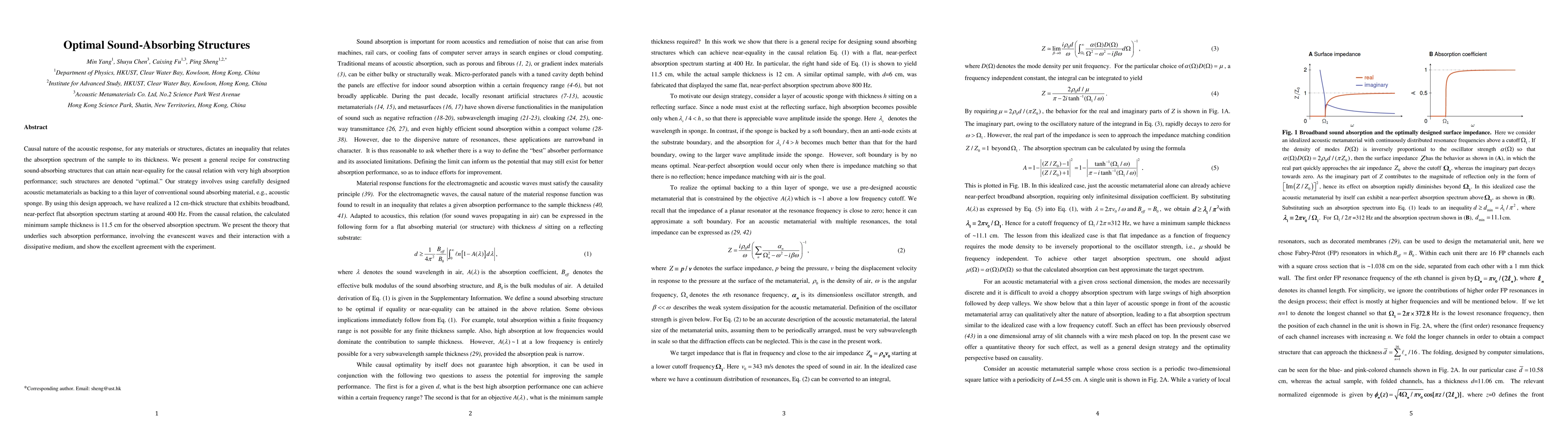 Causal nature of the acoustic response, for any materials or structures, dictates an inequality that relates the absorption spectrum of the sample to its thickness. We present a general recipe for constructing sound-absorbing structures that can attain near-equality for the causal relation with very high absorption performance; such structures are denoted optimal. Our strategy involves using carefully designed acoustic metamaterials as backing to a thin layer of conventional sound absorbing material, e.g., acoustic sponge. By using this design approach, we have realized a 12 cm-thick structure that exhibits broadband, near-perfect flat absorption spectrum starting at around 400 Hz. From the causal relation, the calculated minimum sample thickness is 11.5 cm for the observed absorption spectrum. We present the theory that underlies such absorption performance, involving the evanescent waves and their interaction with a dissipative medium, and show the excellent agreement with the experiment.