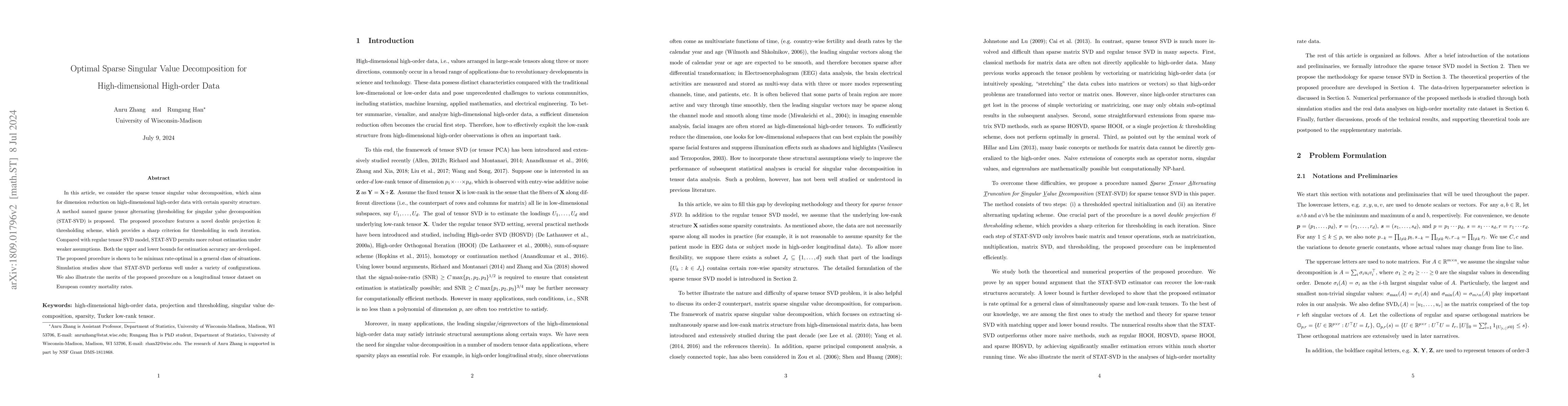 A new method called STAT-SVD is proposed for reducing dimensionality in high-dimensional high-order data with a certain sparsity structure, offering more robust estimation under weaker assumptions than traditional tensor SVD models.