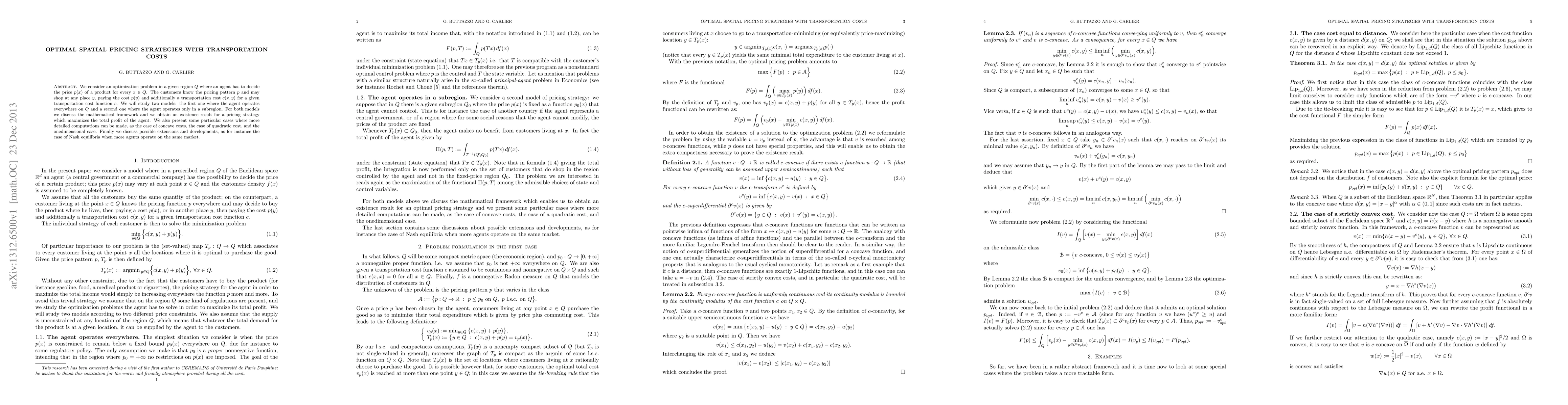 We consider an optimization problem in a given region $Q$ where an agent has to decide the price $p(x)$ of a product for every $x\in Q$. The customers know the pricing pattern $p$ and may shop at any place $y$, paying the cost $p(y)$ and additionally a transportation cost $c(x,y)$ for a given transportation cost function $c$. We will study two models: the first one where the agent operates everywhere on $Q$ and a second one where the agent operates only in a subregion. For both models we discuss the mathematical framework and we obtain an existence result for a pricing strategy which maximizes the total profit of the agent. We also present some particular cases where more detailed computations can be made, as the case of concave costs, the case of quadratic cost, and the onedimensional case. Finally we discuss possible extensions and developments, as for instance the case of Nash equilibria when more agents operate on the same market.