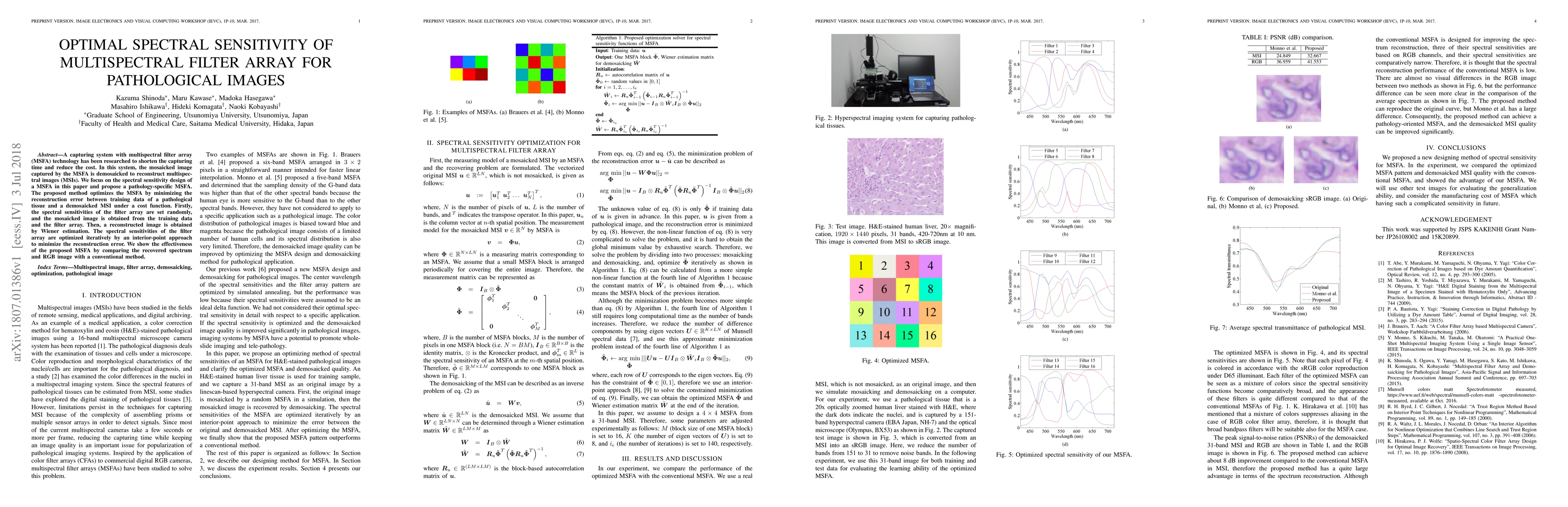 This paper proposes a pathology-specific multispectral filter array (MSFA) to optimize spectral sensitivity for capturing pathological images, aiming to reduce capturing time and cost. The method iteratively optimizes filter array sensitivities to minimize reconstruction error, demonstrating improved performance compared to conventional methods.