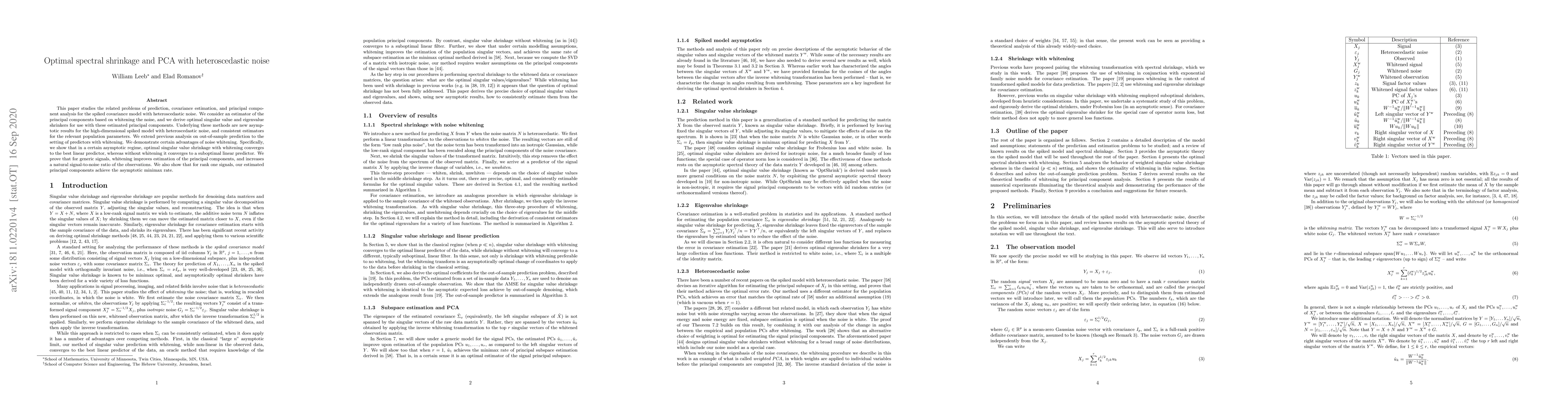 This paper develops optimal spectral shrinkage methods for PCA in the spiked covariance model with heteroscedastic noise, showing that noise whitening significantly improves prediction and estimation accuracy, achieving the best linear predictor in certain asymptotic regimes.