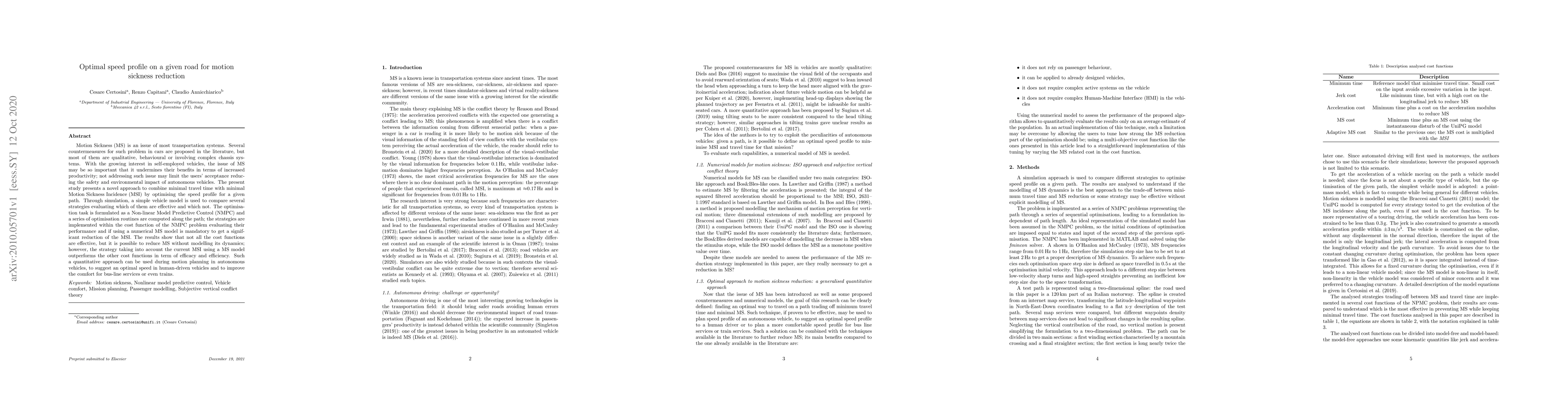Motion Sickness (MS) is an issue of most transportation systems. Several countermeasures for such problem in cars are proposed in the literature, but most of them are qualitative, behavioural or involving complex chassis systems. With the growing interest in self-employed vehicles, the issue of MS may be so important that it undermines their benefits in terms of increased productivity; not addressing such issue may limit the users' acceptance reducing the safety and environmental impact of autonomous vehicles. The present study presents a novel approach to combine minimal travel time with minimal Motion Sickness Incidence (MSI) by optimising the speed profile for a given path. Through simulation, a simple vehicle model is used to compare several strategies evaluating which of them are effective and which not. The optimisation task is formulated as a Non-linear Model Predictive Control (NMPC) and a series of optimisation routines are computed along the path; the strategies are implemented within the cost function of the NMPC problem evaluating their performance and if using a numerical MS model is mandatory to get a significant reduction of the MSI. The results show that not all the cost functions are effective, but it is possible to reduce MS without modelling its dynamics; however, the strategy taking into account the current MSI using a MS model outperforms the other cost functions in term of efficacy and efficiency. Such a quantitative approach can be used during motion planning in autonomous vehicles, to suggest an optimal speed in human-driven vehicles and to improve the comfort for bus-line services or even trains.