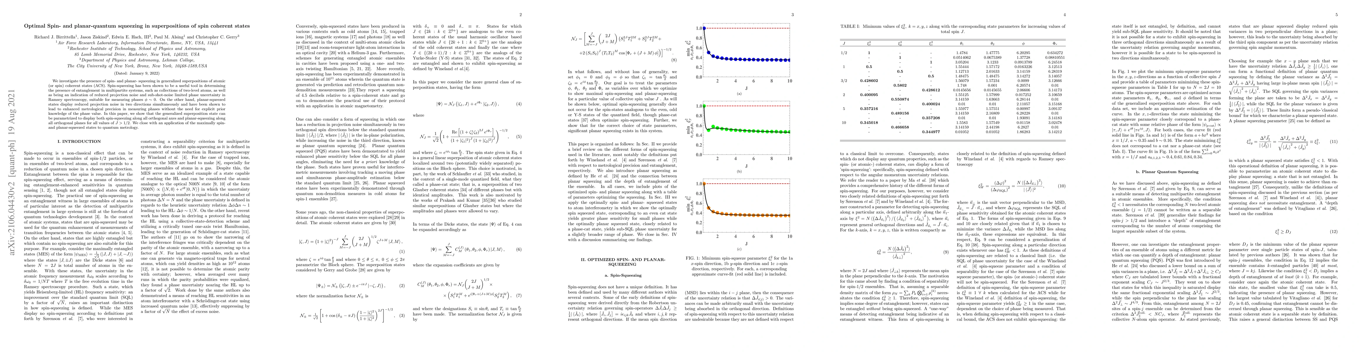 This paper explores optimal spin- and planar-squeezing in generalized superpositions of atomic coherent states, demonstrating their potential for enhanced metrological precision and reduced projection noise in quantum metrology. The study reveals that these states can exhibit both spin-squeezing along all axes and planar-squeezing in all planes, applicable for measuring phases with minimal uncertainty.