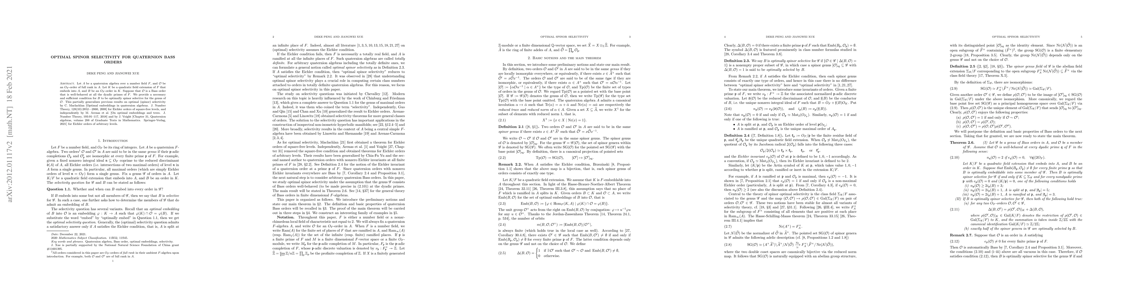Let $A$ be a quaternion algebra over a number field $F$, and $\mathcal{O}$ be an $O_F$-order of full rank in $A$. Let $K$ be a quadratic field extension of $F$ that embeds into $A$, and $B$ be an $O_F$-order in $K$. Suppose that $\mathcal{O}$ is a Bass order that is well-behaved at all the dyadic primes of $F$. We provide a necessary and sufficient condition for $B$ to be optimally spinor selective for the genus of $\mathcal{O}$. This partially generalizes previous results on optimal (spinor) selectivity by C. Maclachlan [Optimal embeddings in quaternion algebras. J. Number Theory, 128(10):2852-2860, 2008] for Eichler orders of square-free levels, and independently by M. Arenas et al. [On optimal embeddings and trees. J. Number Theory, 193:91-117, 2018] and by J. Voight [Chapter 31, Quaternion algebras, volume 288 of Graduate Texts in Mathematics. Springer-Verlag, 2021] for Eichler orders of arbitrary levels.
