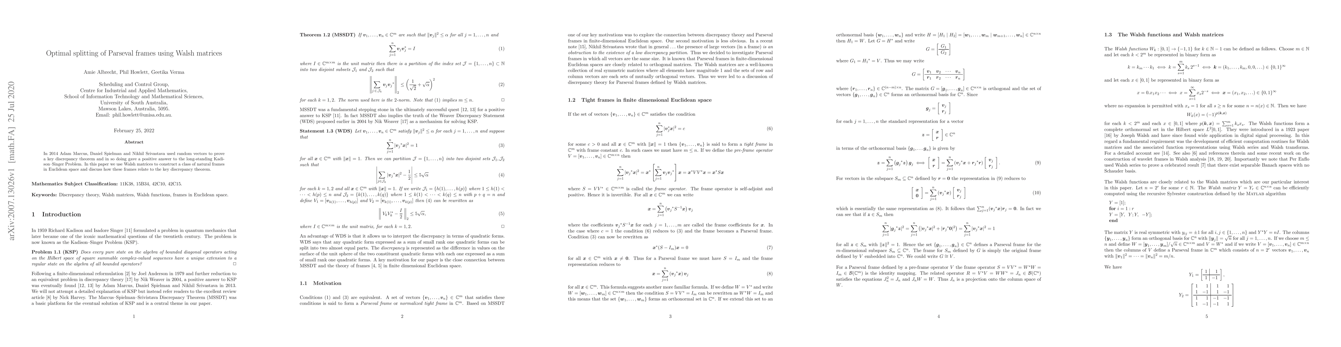 In 2014 Adam Marcus, Daniel Spielman and Nikhil Srivastava used random vectors to prove a key discrepancy theorem and in so doing gave a positive answer to the long-standing Kadison-Singer Problem. In this paper we use Walsh matrices to construct a class of natural frames in Euclidean space and discuss how these frames relate to the key discrepancy theorem.