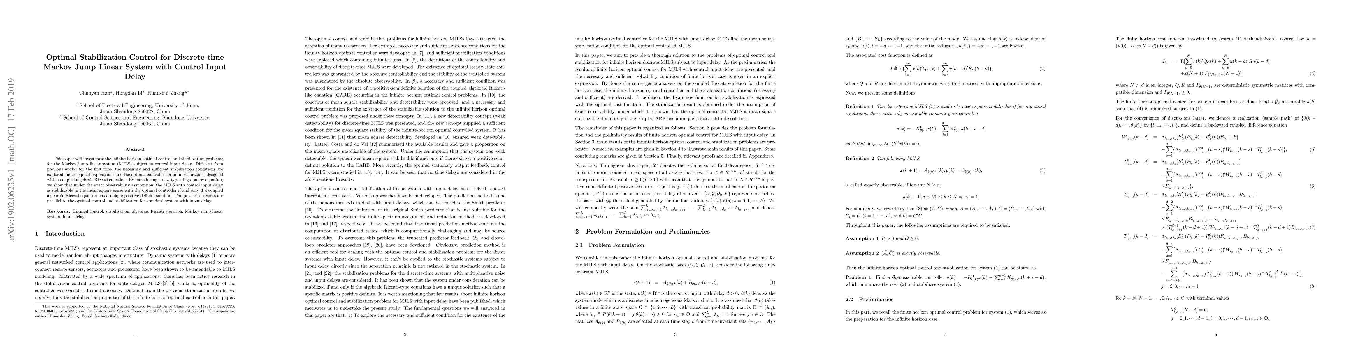 This paper explores optimal stabilization conditions for a discrete-time Markov jump linear system with control input delay, presenting necessary and sufficient stabilization criteria and designing an optimal controller via a coupled algebraic Riccati equation. It introduces a new Lyapunov equation to demonstrate stabilizability under exact observability.