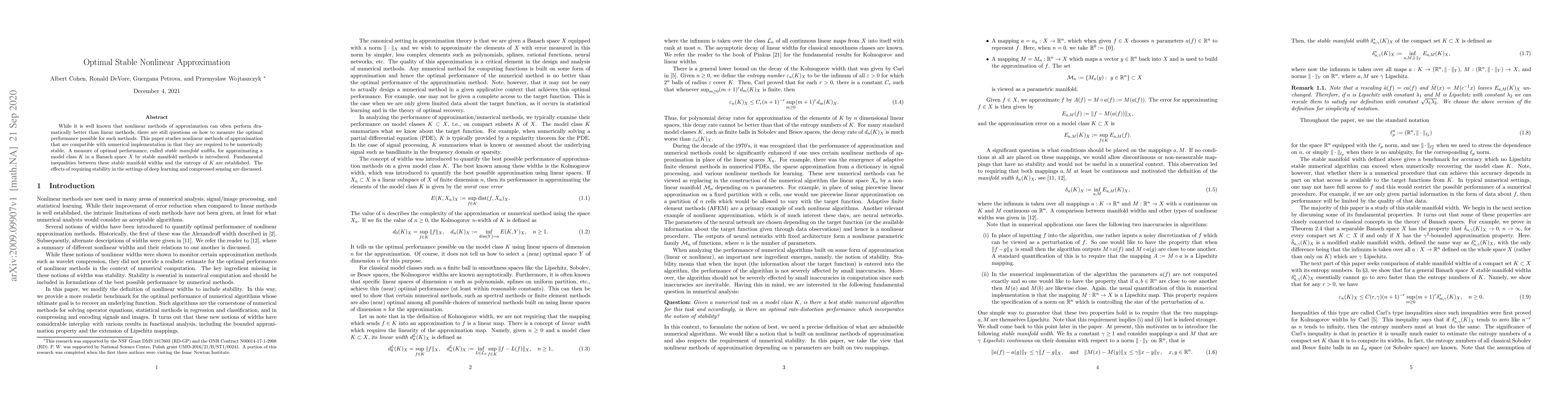 While it is well known that nonlinear methods of approximation can often perform dramatically better than linear methods, there are still questions on how to measure the optimal performance possible for such methods. This paper studies nonlinear methods of approximation that are compatible with numerical implementation in that they are required to be numerically stable. A measure of optimal performance, called {\em stable manifold widths}, for approximating a model class $K$ in a Banach space $X$ by stable manifold methods is introduced. Fundamental inequalities between these stable manifold widths and the entropy of $K$ are established. The effects of requiring stability in the settings of deep learning and compressed sensing are discussed.