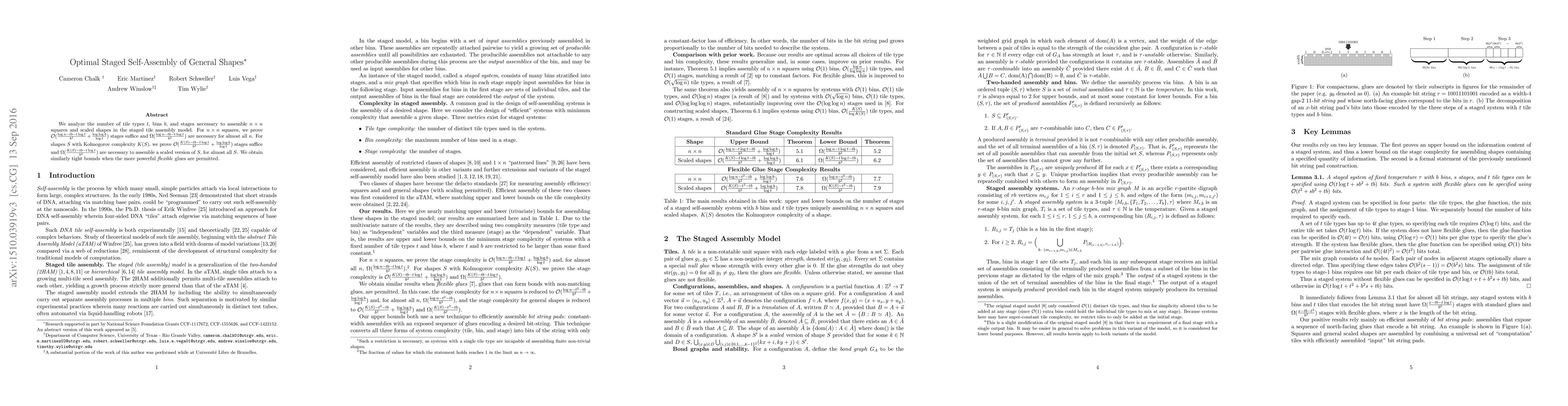 We analyze the number of tile types $t$, bins $b$, and stages necessary to assemble $n \times n$ squares and scaled shapes in the staged tile assembly model. For $n \times n$ squares, we prove $\mathcal{O}(\frac{\log{n} - tb - t\log t}{b^2} + \frac{\log \log b}{\log t})$ stages suffice and $\Omega(\frac{\log{n} - tb - t\log t}{b^2})$ are necessary for almost all $n$. For shapes $S$ with Kolmogorov complexity $K(S)$, we prove $\mathcal{O}(\frac{K(S) - tb - t\log t}{b^2} + \frac{\log \log b}{\log t})$ stages suffice and $\Omega(\frac{K(S) - tb - t\log t}{b^2})$ are necessary to assemble a scaled version of $S$, for almost all $S$. We obtain similarly tight bounds when the more powerful flexible glues are permitted.